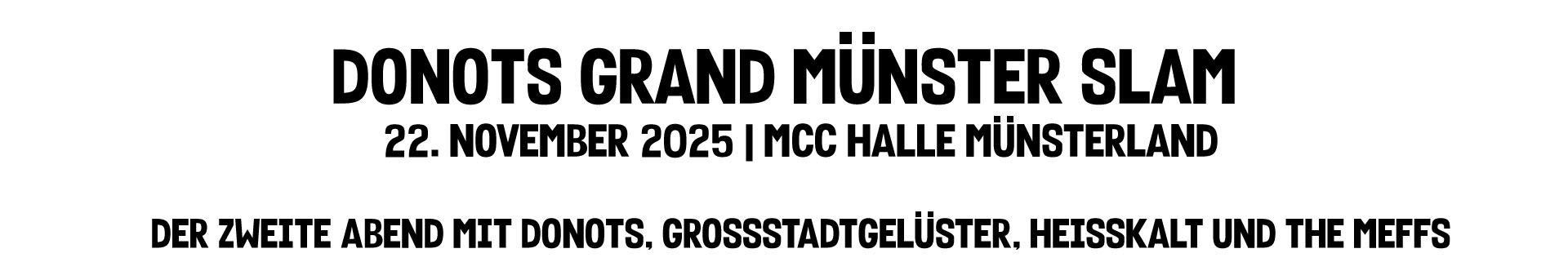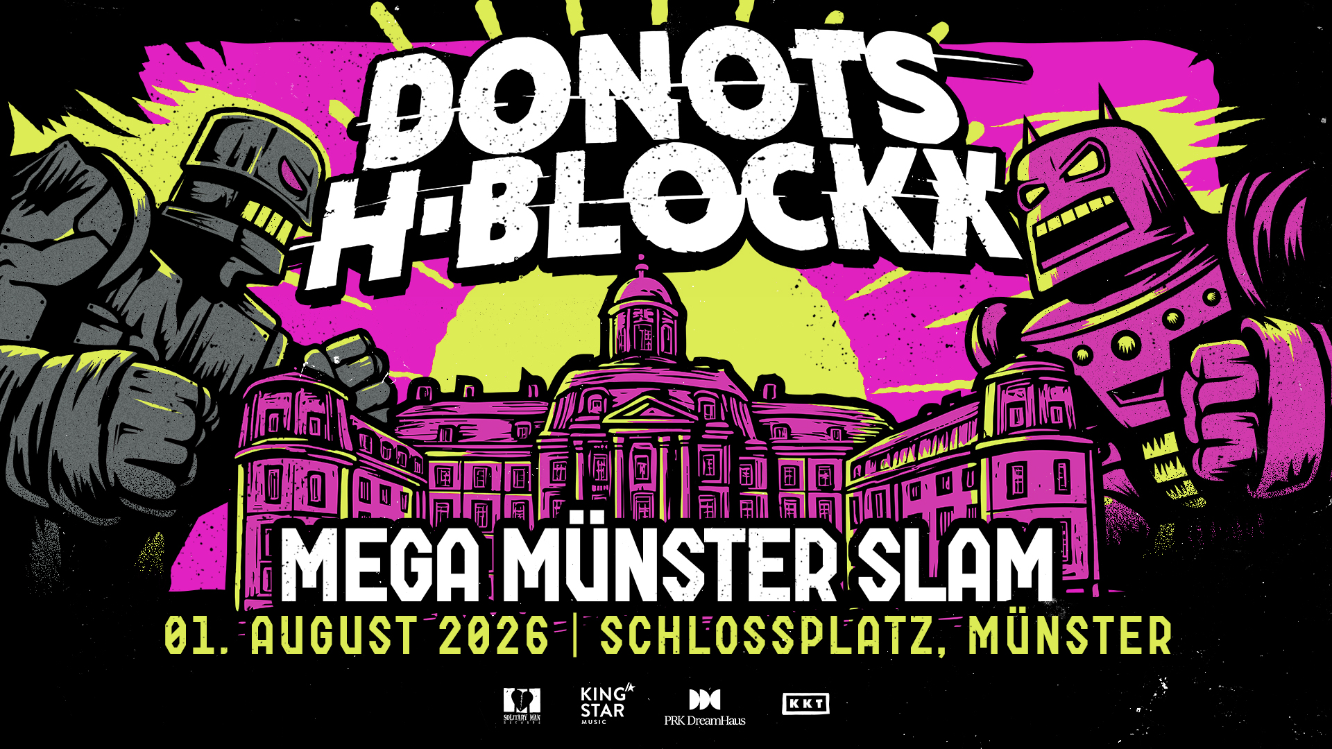 Wer die DONOTS auch im nächsten Jahr noch einmal auf großer Bühne in Münster sehen möchte, der hat am 01. August 2026 die Möglichkeit beim MEGA MÜNSTER SLAM auf dem Schlossplatz. Dort werden sie sich die Bühne mit einem weiteren Local Hero teilen: den H-BLOCKX.
