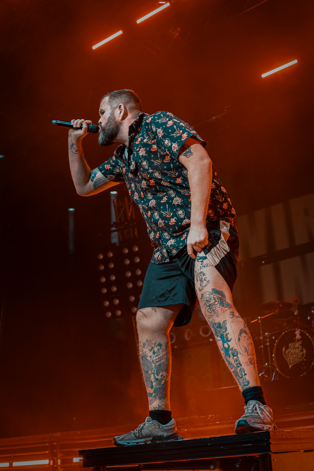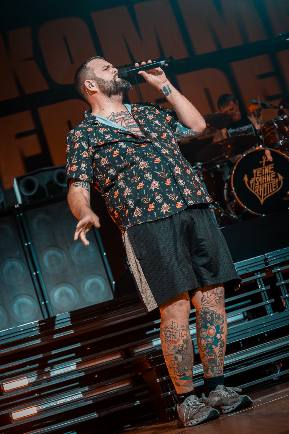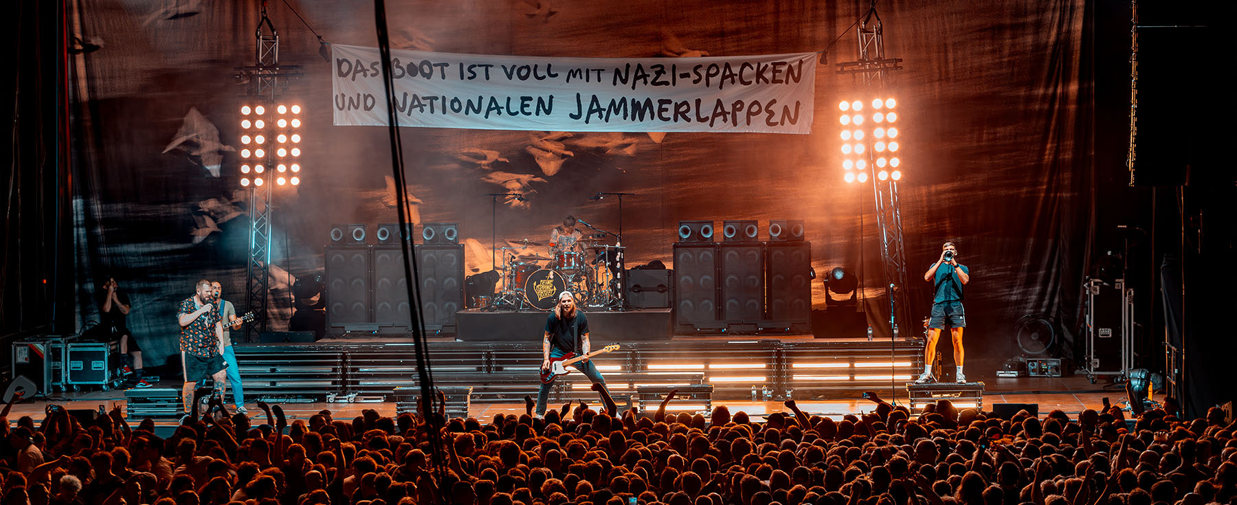 Monchi eilte von rechts nach links über die Bühne und wieder zurück. Auch Kai am Bass hielt es nicht lange an einem Platz. Mal vorne an der Monitorbox, mal oben auf dem Schlagzeugpodest neben Drummer Olaf, aber immer mit einem strahlen im Gesicht. Genauso viel Bewegung wie auf der Bühne ließ sich auch vor der Bühne wahrnehmen. So verwunderte es auch nicht, dass Monchi die Bühne verließ und im Graben das Publikum begrüßte und großzügig Bier unter und auf die Leute zu bringen.