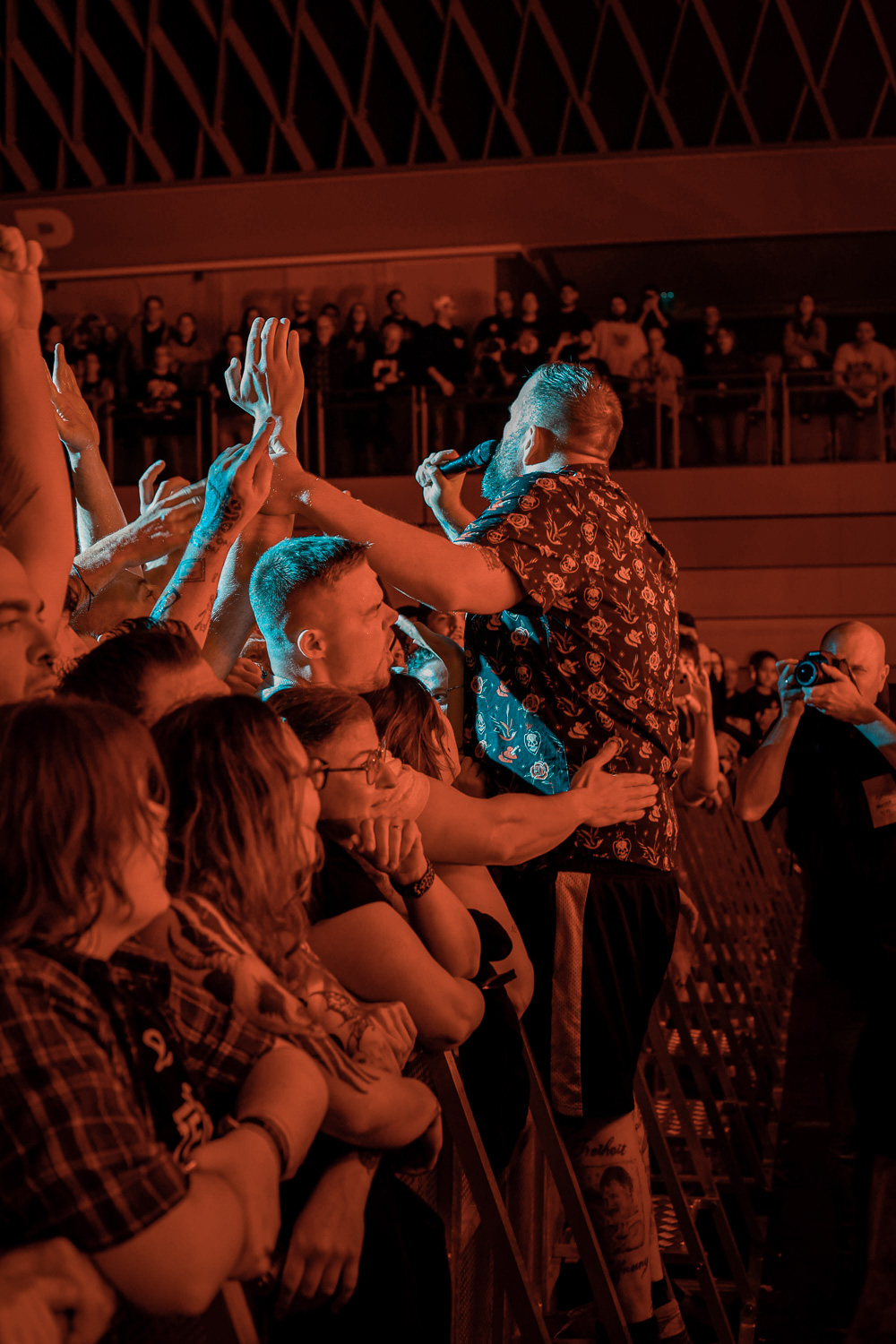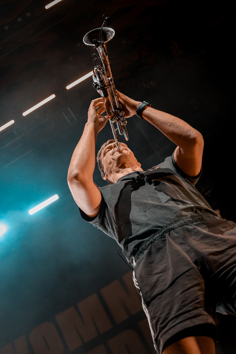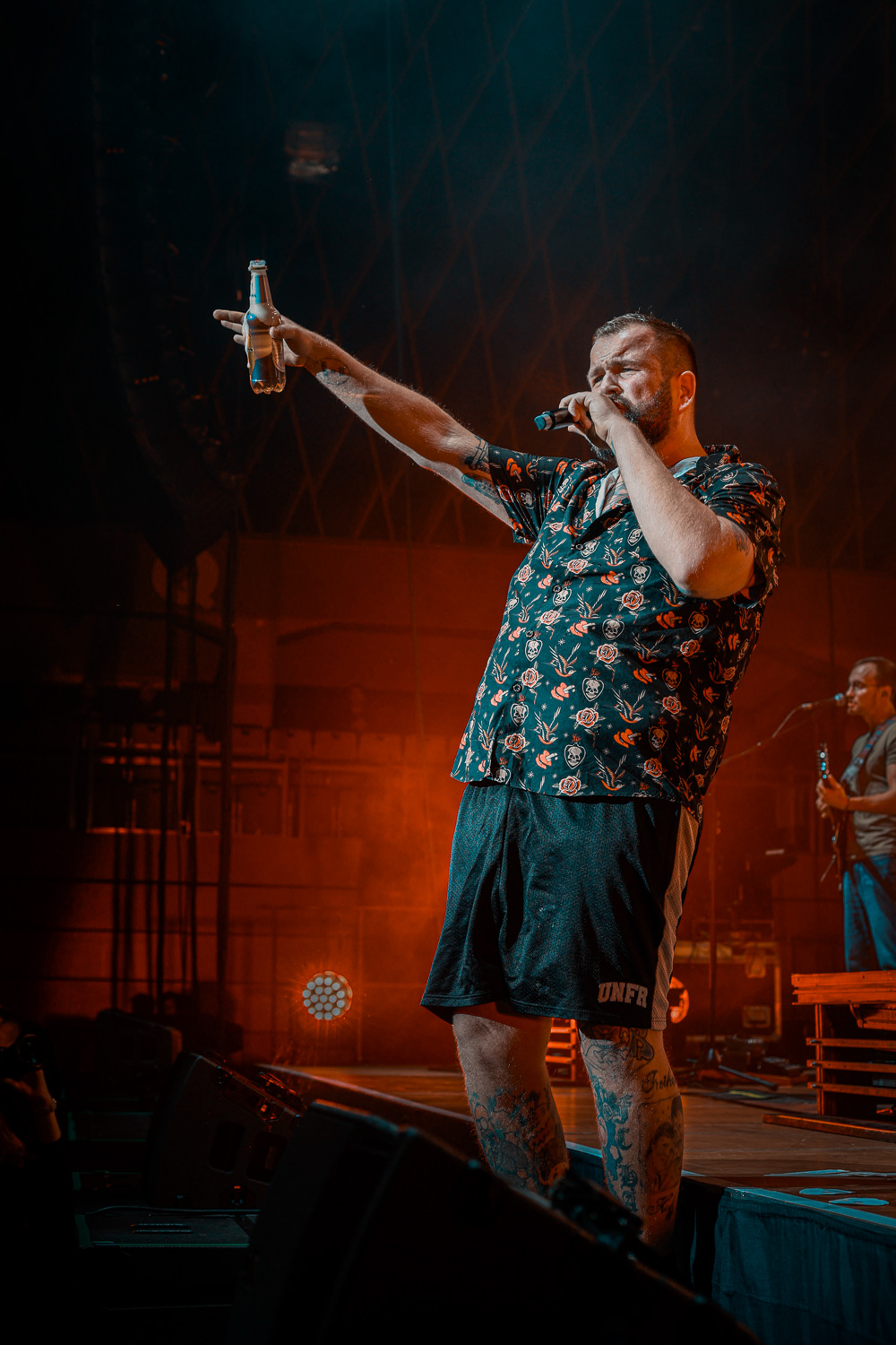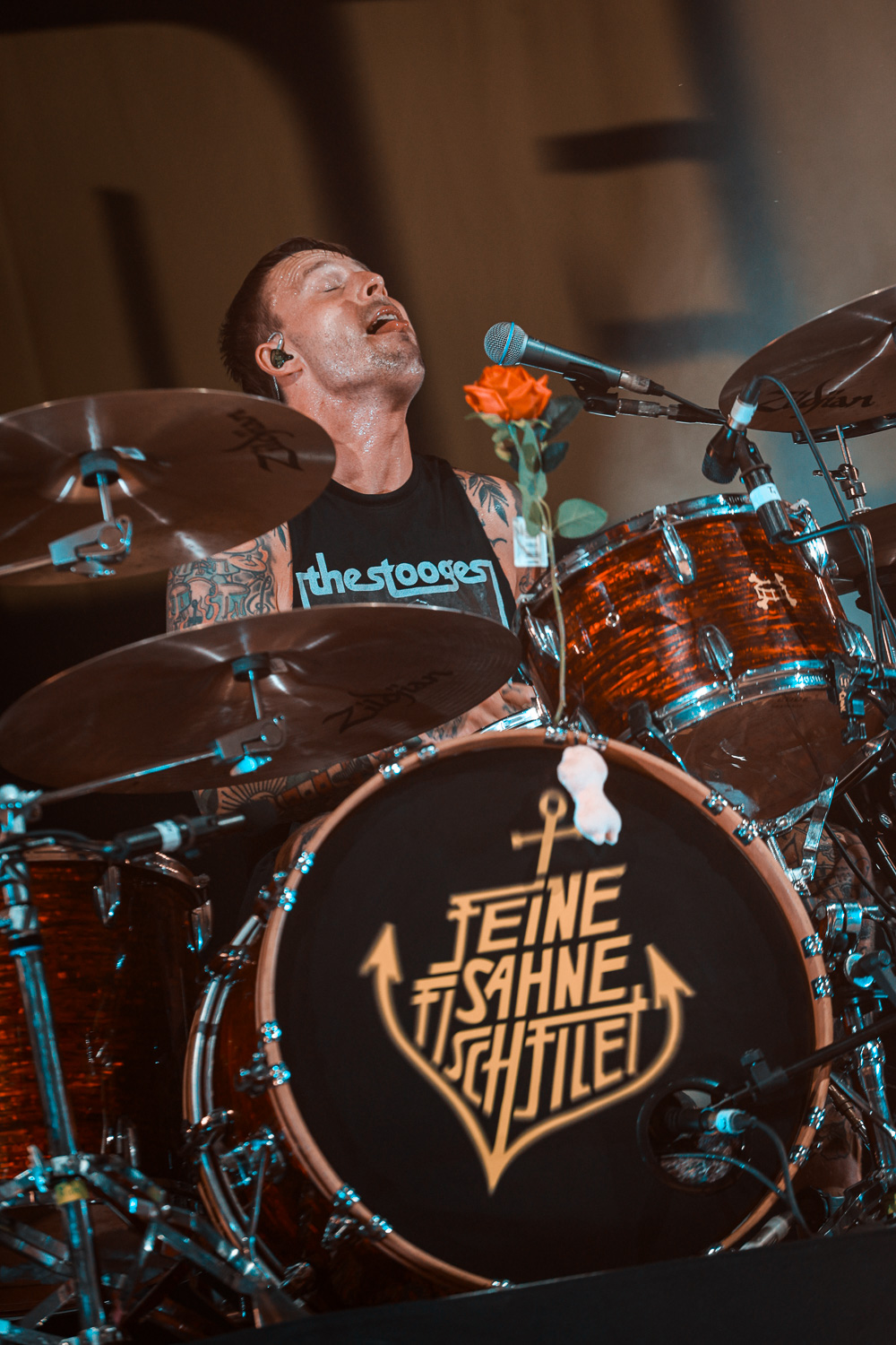 Monchi eilte von rechts nach links über die Bühne und wieder zurück. Auch Kai am Bass hielt es nicht lange an einem Platz. Mal vorne an der Monitorbox, mal oben auf dem Schlagzeugpodest neben Drummer Olaf, aber immer mit einem strahlen im Gesicht. Genauso viel Bewegung wie auf der Bühne ließ sich auch vor der Bühne wahrnehmen. So verwunderte es auch nicht, dass Monchi die Bühne verließ und im Graben das Publikum begrüßte und großzügig Bier unter und auf die Leute zu bringen.