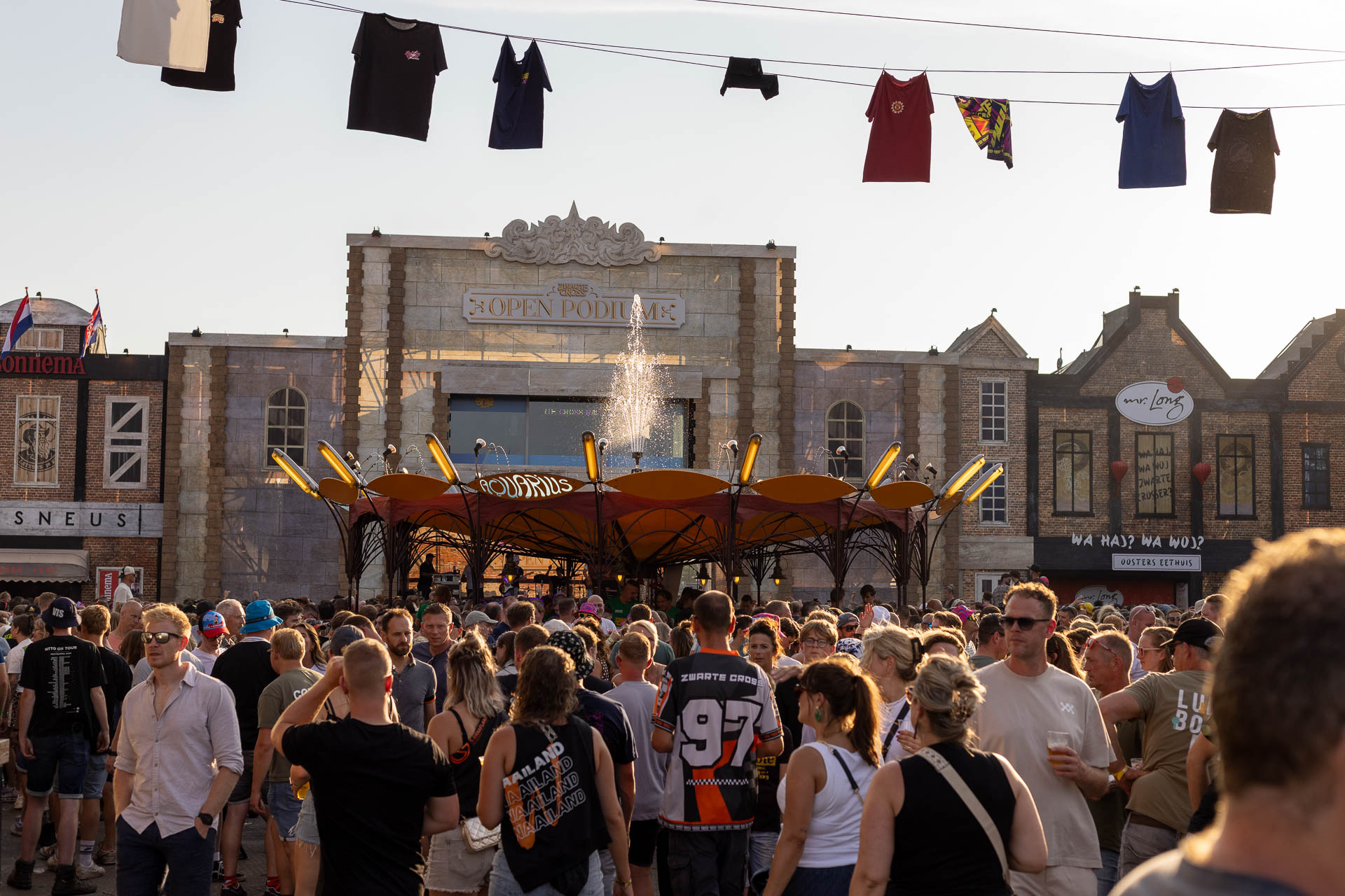Vorbei an den Fahrgeschäften, die in der untergehenden Sonne eine schöne Silhouette bieten in Richtung Hoofdpodium. Ab und zu wird man noch angesprochen, weil die Besucher gerne auf ein Foto möchten. Leider muss ich dann erst einmal klarstellen, dass ich kein Niederländisch verstehen kann obwohl ich direkt an der Grenze wohne, also wird auf Englisch kommuniziert. Vor der Hauptbühne hat sich auch schon eine ganze Meute Fotografen versammelt. Sehr gut finde ich eine ältere und kleinere Fotografin. Sie war auch schon öfter hier und kennt die riesengroße und vor allem hohe Bühne. Aus dem Fotograben hat man keine Chance das Schlagzeug zu sehen, aus diesem Grund hat eben diese Fotografin einen Klapphocker unter´m Arm. Sehr kreativ.