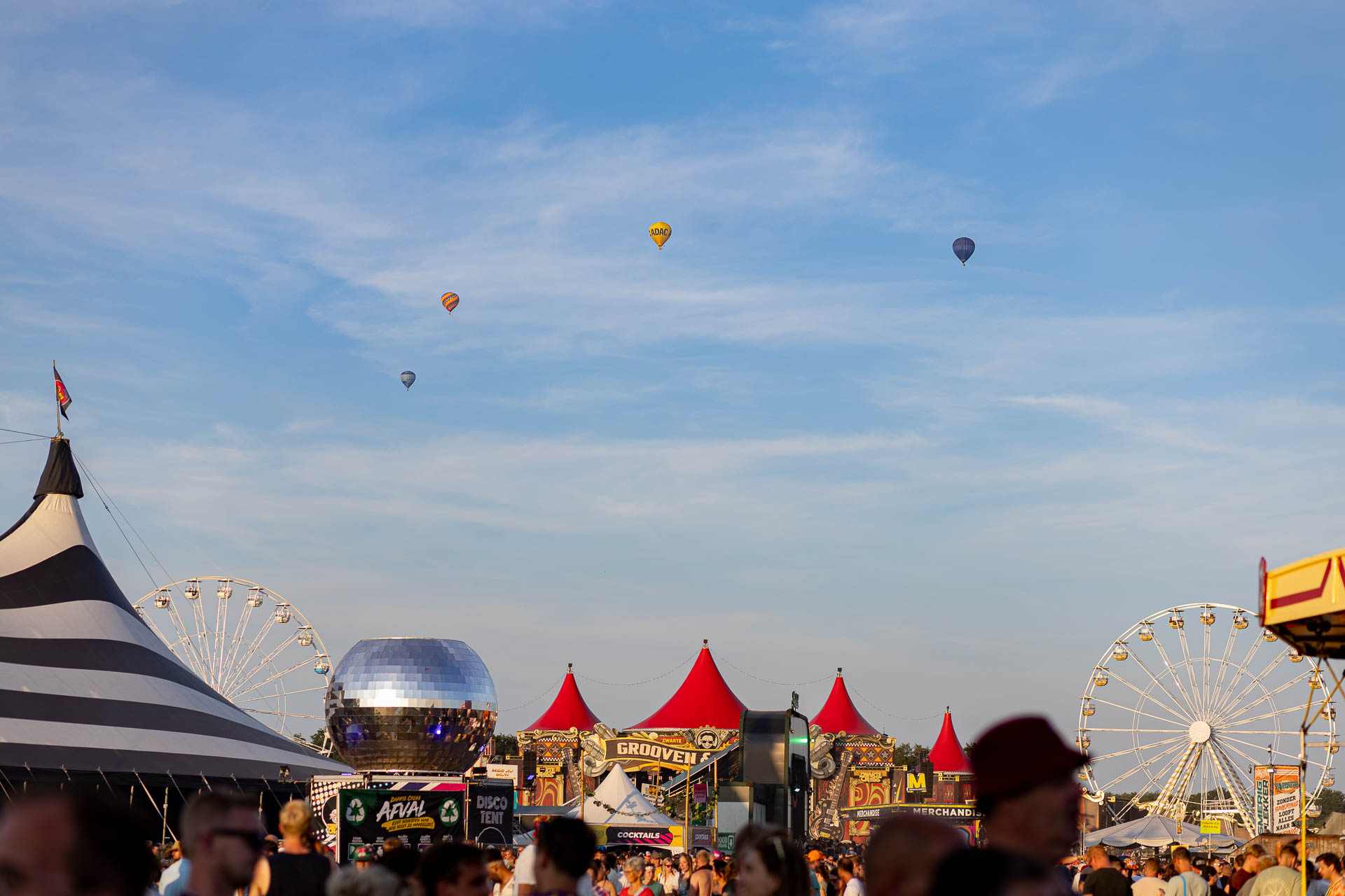Auf dem Weg zum Pressezelt schweift mein Blick über das Festivalgelände. Am Himmel schweben Heißluftballons über der Hauptbühne. Anscheinend wollen sie sich den Trubel aus der Luft ansehen, da ein Ballon vom ADAC dabei ist, gehe ich mal davon aus, dass da oben auch Deutsche im Korb fröhlich winken.