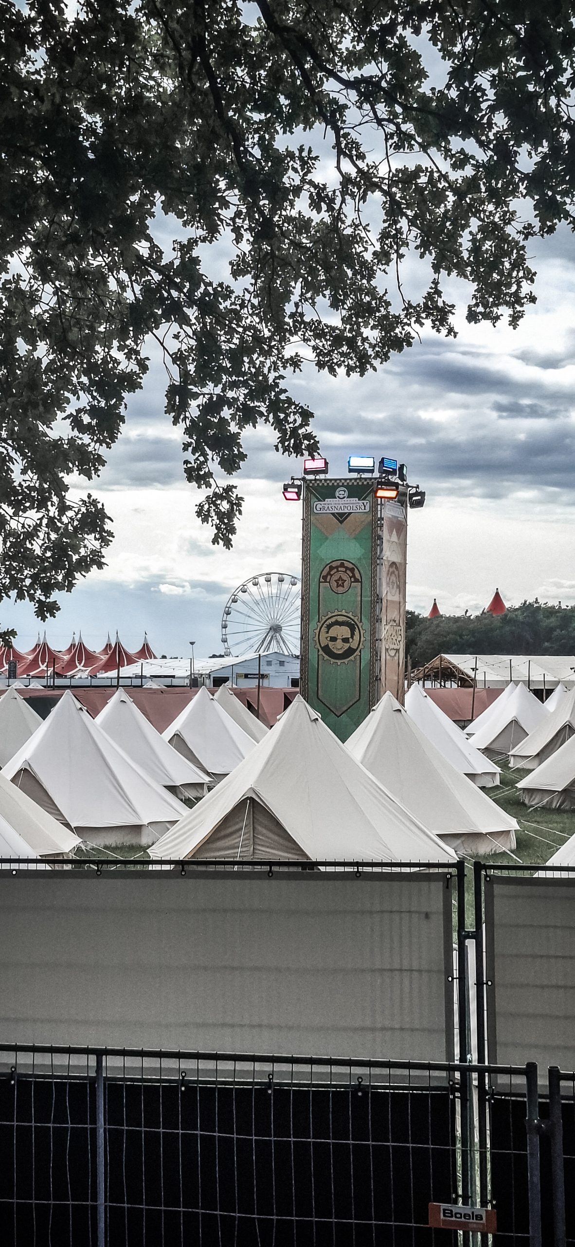 Auf dem Weg zum Pressezelt schweift mein Blick über das Festivalgelände. Am Himmel schweben Heißluftballons über der Hauptbühne. Anscheinend wollen sie sich den Trubel aus der Luft ansehen, da ein Ballon vom ADAC dabei ist, gehe ich mal davon aus, dass da oben auch Deutsche im Korb fröhlich winken.