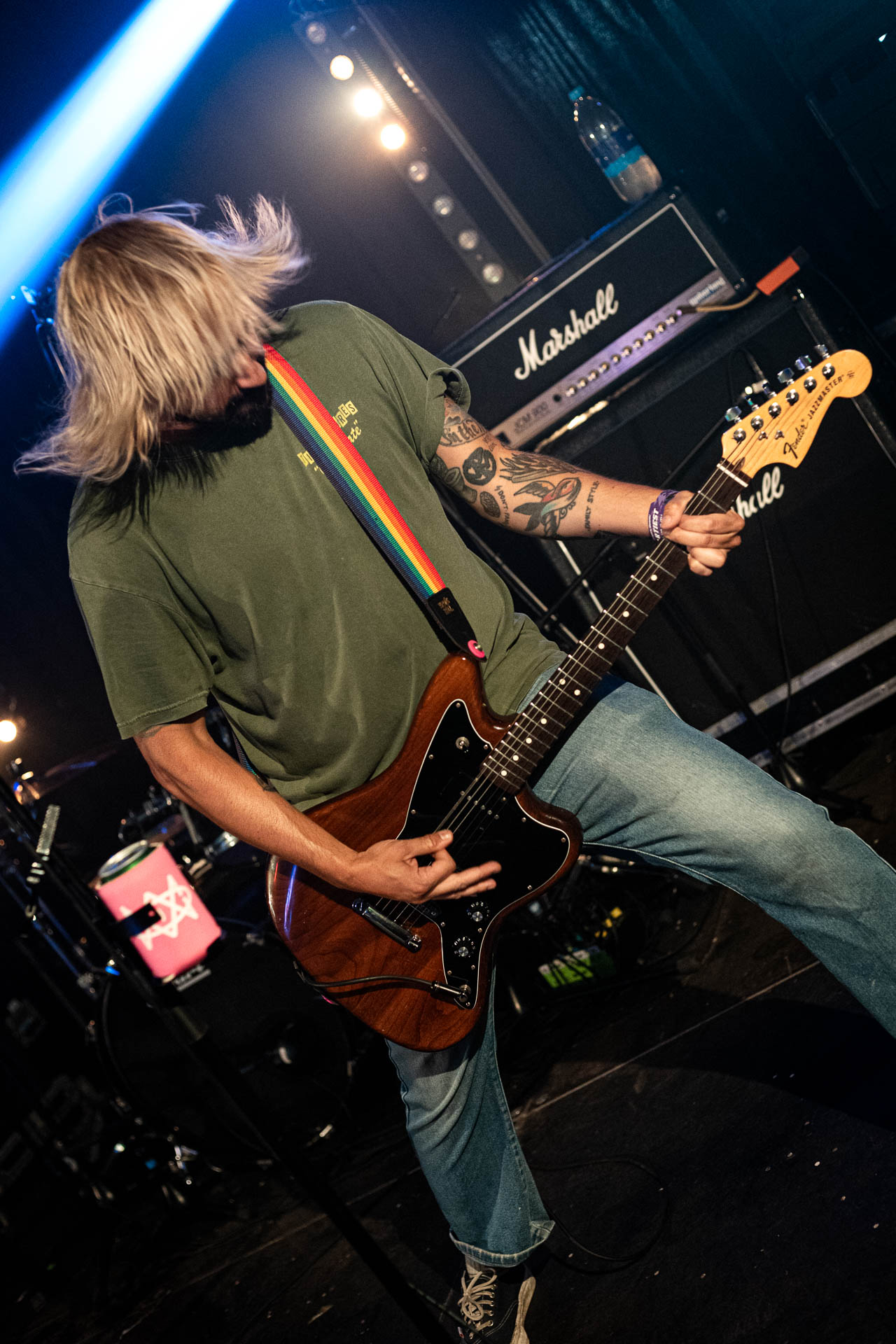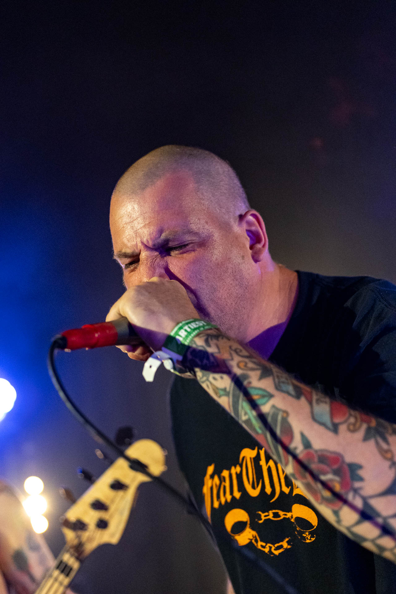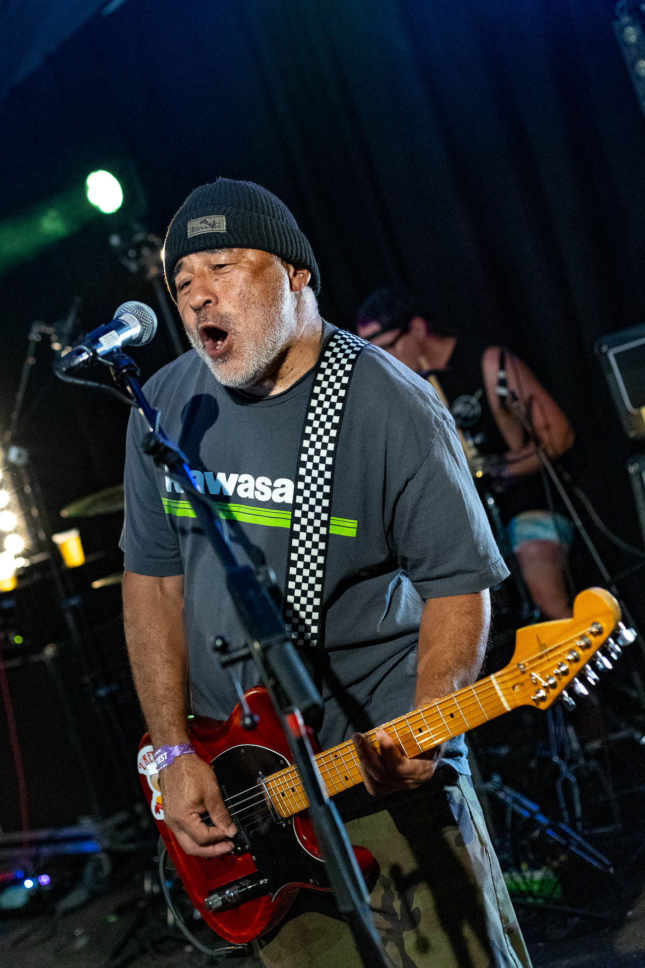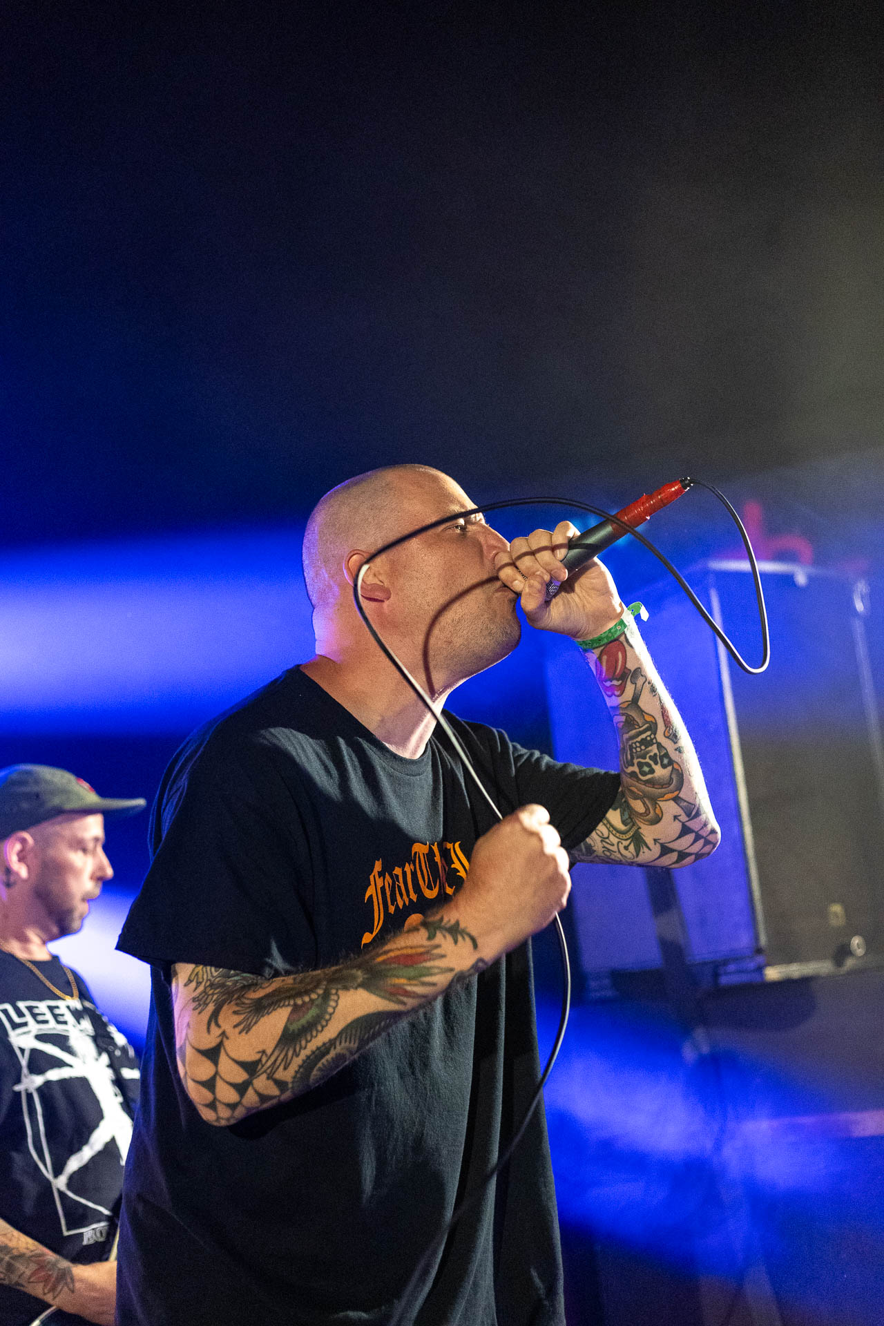 Die erste Band, die ich heute fotografiere tritt, wie kann es auch anders sein, im Café Harder auf. Urethane aus San Diego passen mit ihren Pop-Punk wie die Faust auf´s Auge in diesen Schuppen. Die Band gründete sich während der Pandemie und wenn ein Musiker der Band auf das Zwarte Cross Festival passt, dann ist es auf jeden Fall Gitarrist Steve Caballero. Die Skateboard-Legende hat sich bestimmt auch den ein oder anderen Stunt angeschaut. Im Noaberhood, der Hip-Hop Ecke bei diesem Festival, steht ja schließlich auch eine Halfpipe.