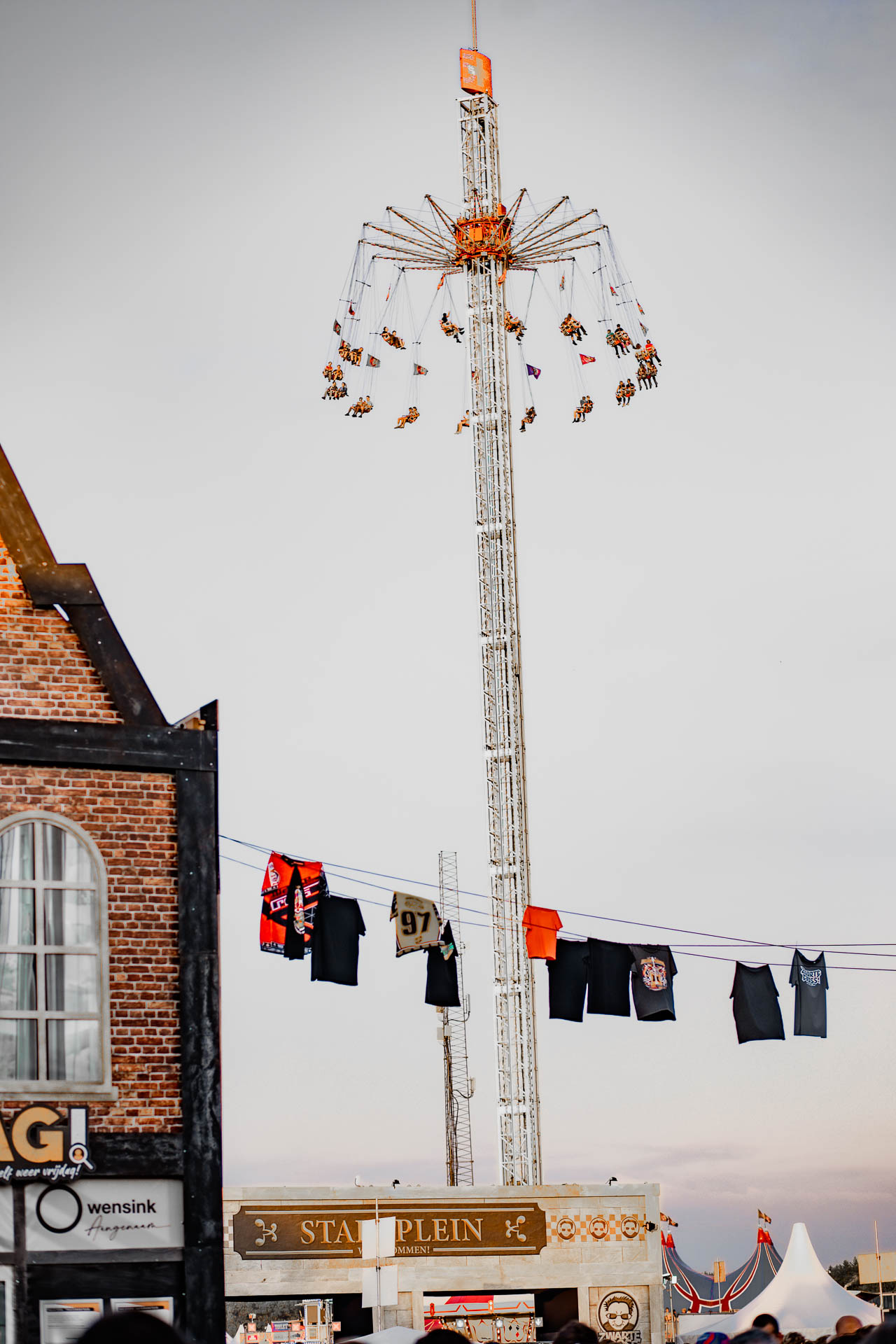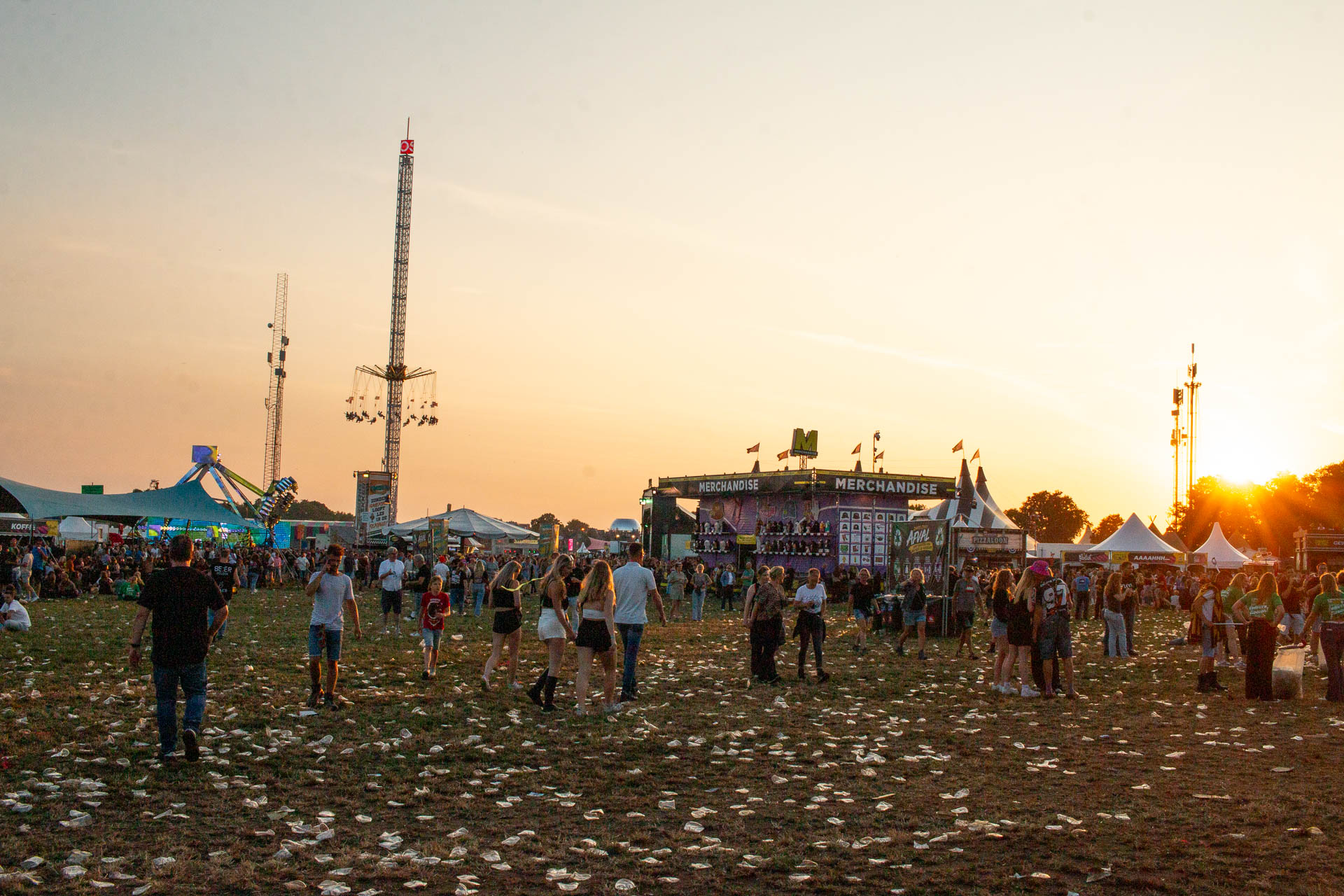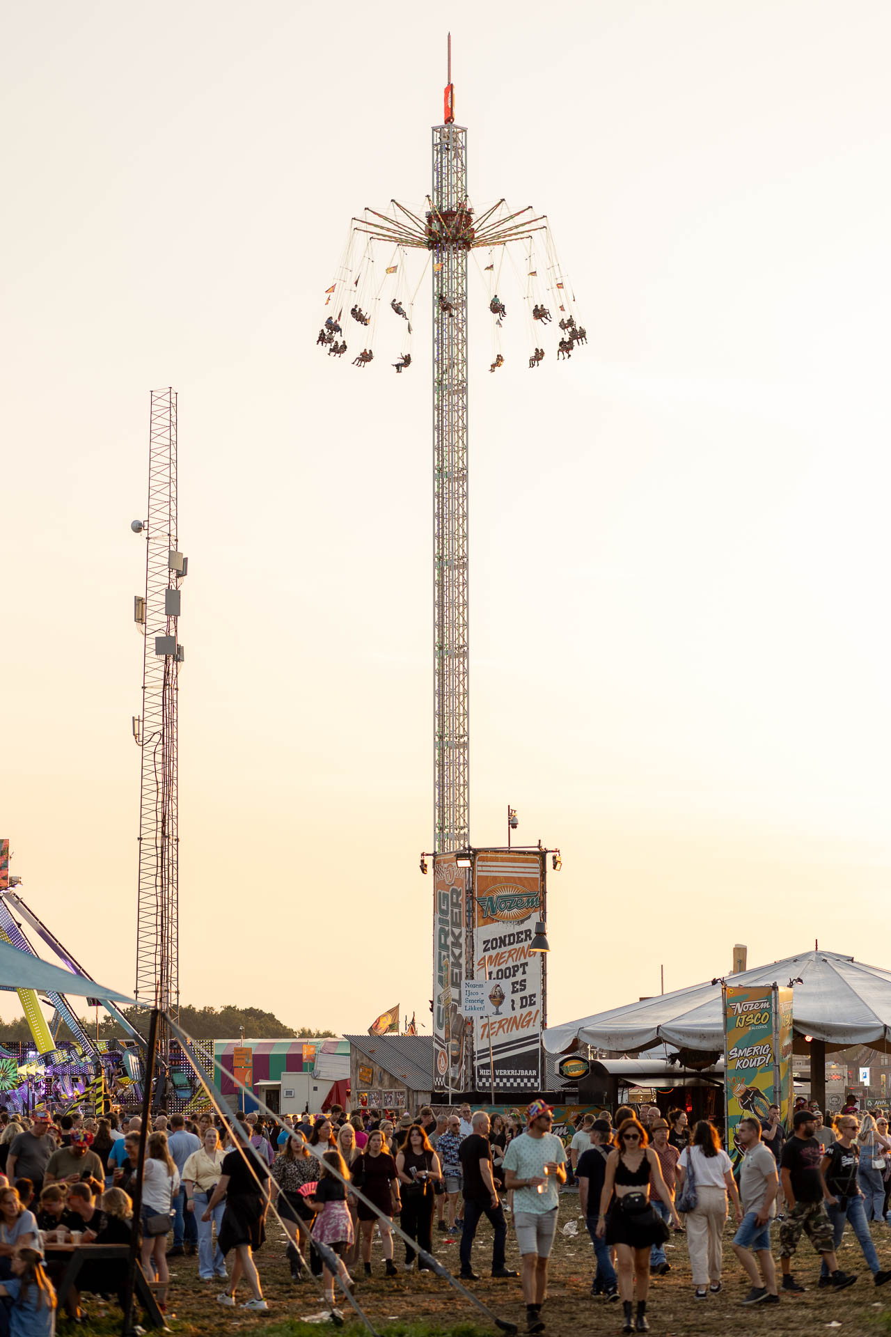 Vorbei an den Fahrgeschäften, die in der untergehenden Sonne eine schöne Silhouette bieten in Richtung Hoofdpodium. Ab und zu wird man noch angesprochen, weil die Besucher gerne auf ein Foto möchten. Leider muss ich dann erst einmal klarstellen, dass ich kein Niederländisch verstehen kann obwohl ich direkt an der Grenze wohne, also wird auf Englisch kommuniziert. Vor der Hauptbühne hat sich auch schon eine ganze Meute Fotografen versammelt. Sehr gut finde ich eine ältere und kleinere Fotografin. Sie war auch schon öfter hier und kennt die riesengroße und vor allem hohe Bühne. Aus dem Fotograben hat man keine Chance das Schlagzeug zu sehen, aus diesem Grund hat eben diese Fotografin einen Klapphocker unter´m Arm. Sehr kreativ.