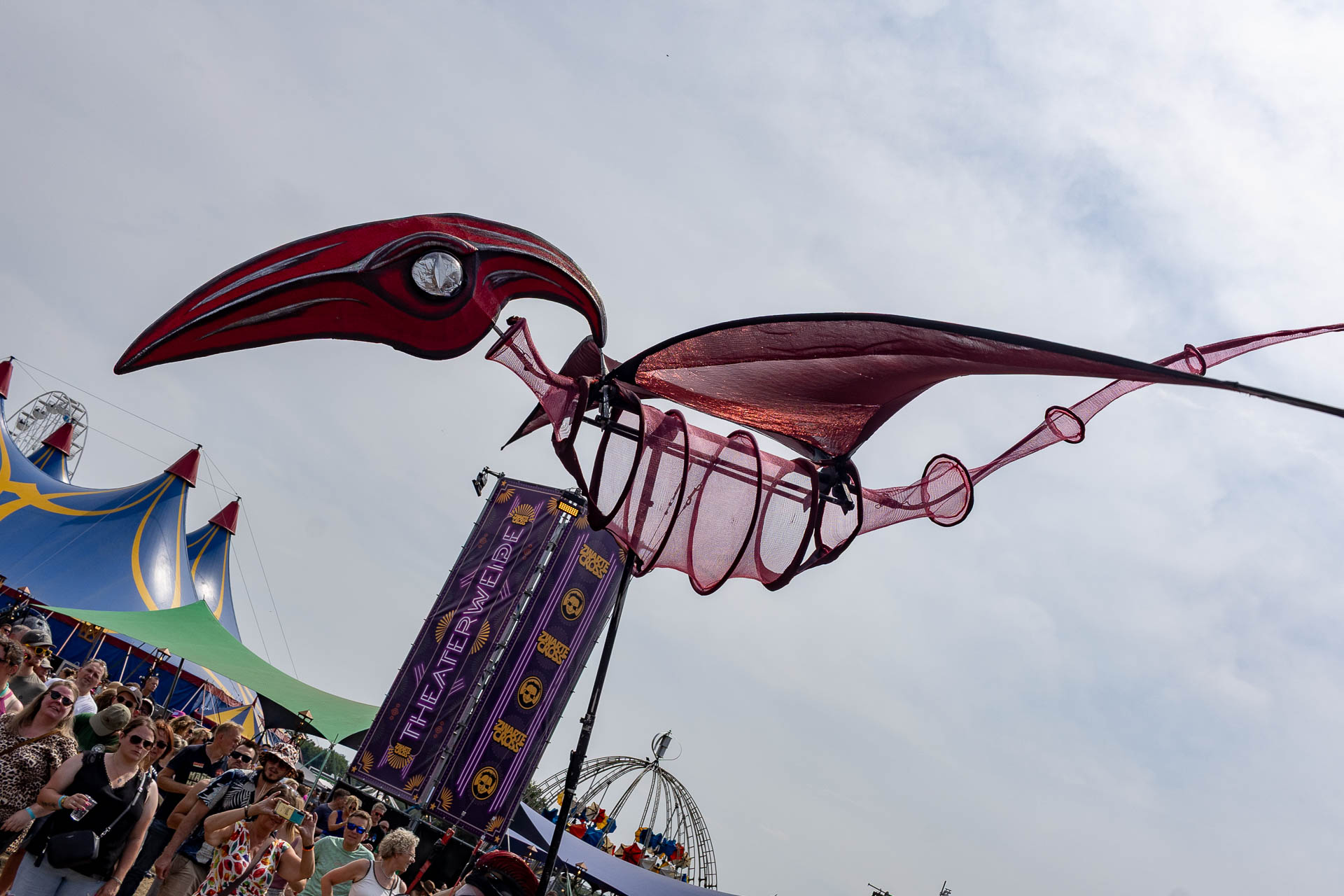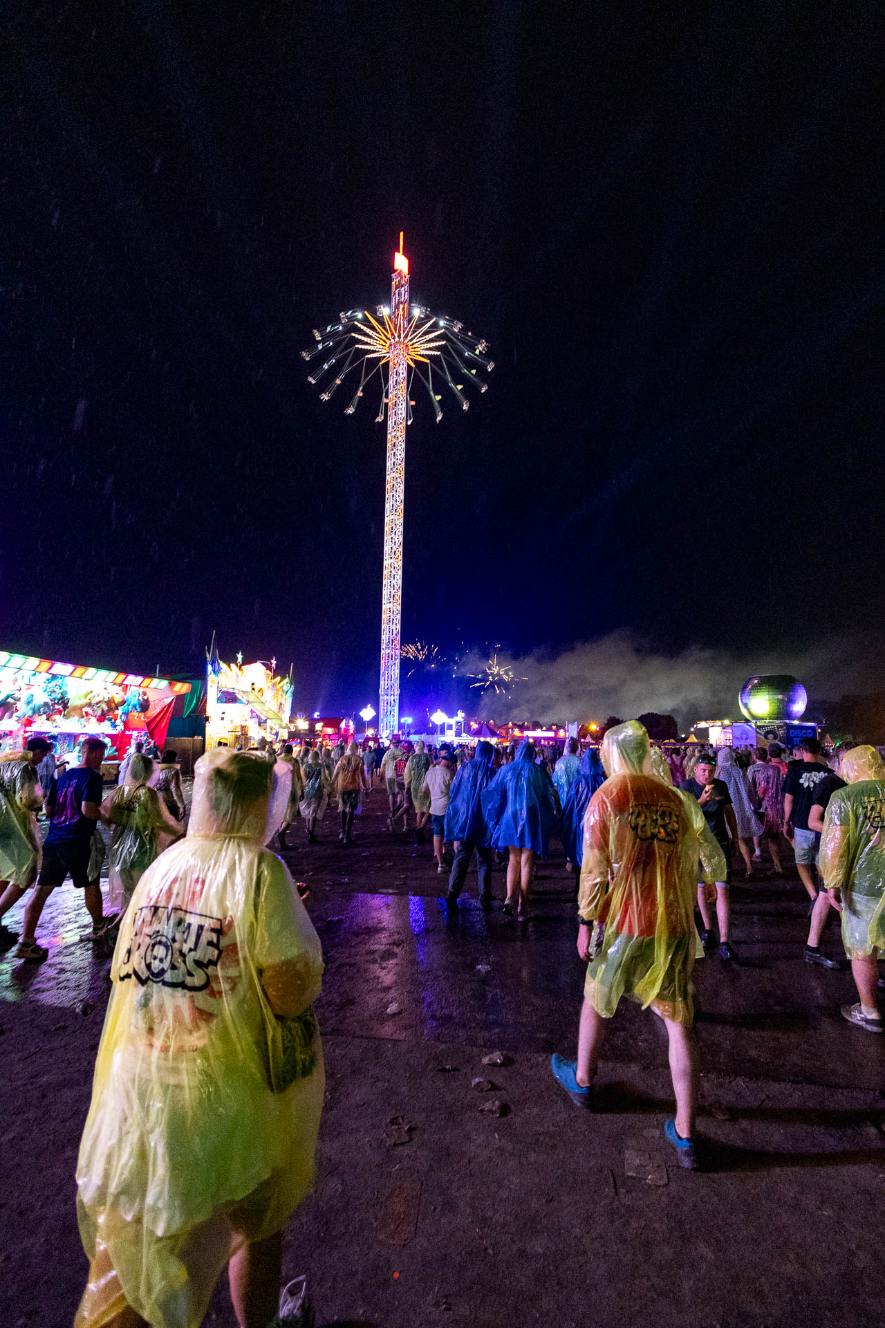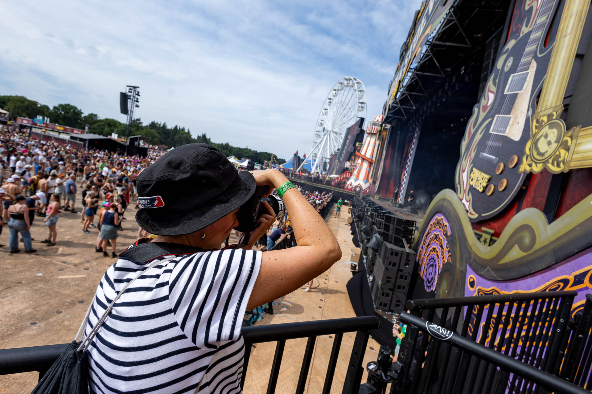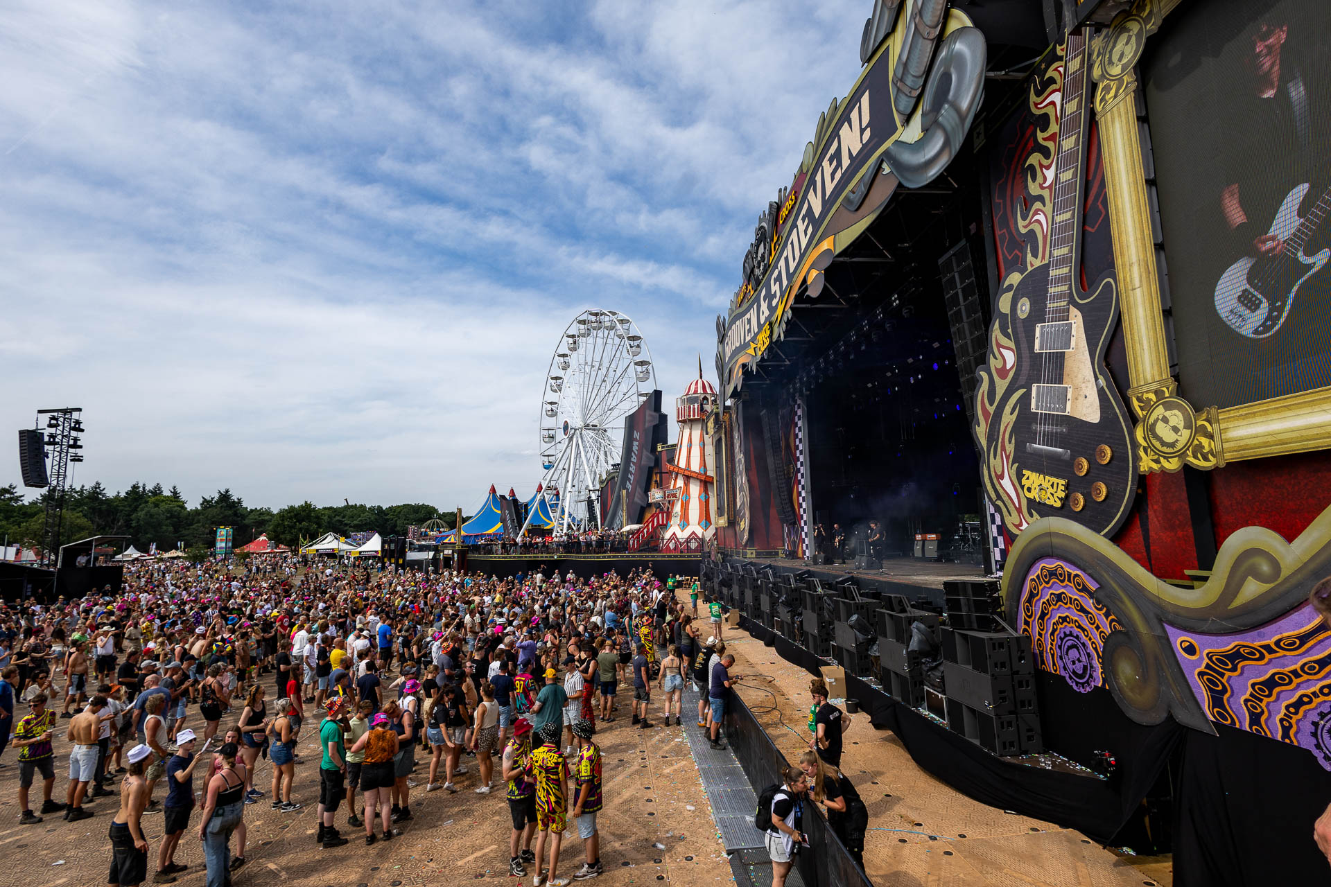 Vorbei an den Fahrgeschäften, die in der untergehenden Sonne eine schöne Silhouette bieten in Richtung Hoofdpodium. Ab und zu wird man noch angesprochen, weil die Besucher gerne auf ein Foto möchten. Leider muss ich dann erst einmal klarstellen, dass ich kein Niederländisch verstehen kann obwohl ich direkt an der Grenze wohne, also wird auf Englisch kommuniziert. Vor der Hauptbühne hat sich auch schon eine ganze Meute Fotografen versammelt. Sehr gut finde ich eine ältere und kleinere Fotografin. Sie war auch schon öfter hier und kennt die riesengroße und vor allem hohe Bühne. Aus dem Fotograben hat man keine Chance das Schlagzeug zu sehen, aus diesem Grund hat eben diese Fotografin einen Klapphocker unter´m Arm. Sehr kreativ.