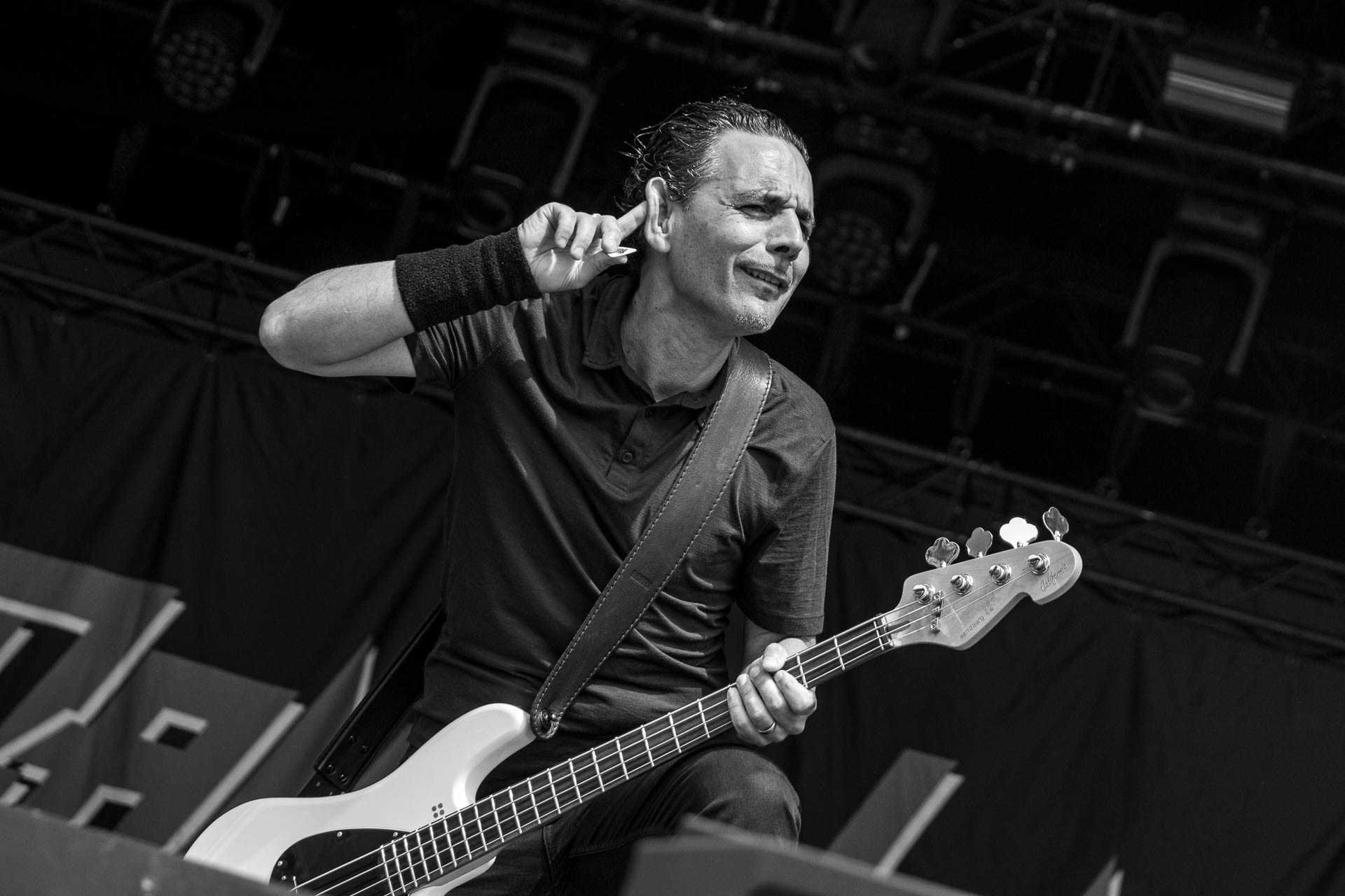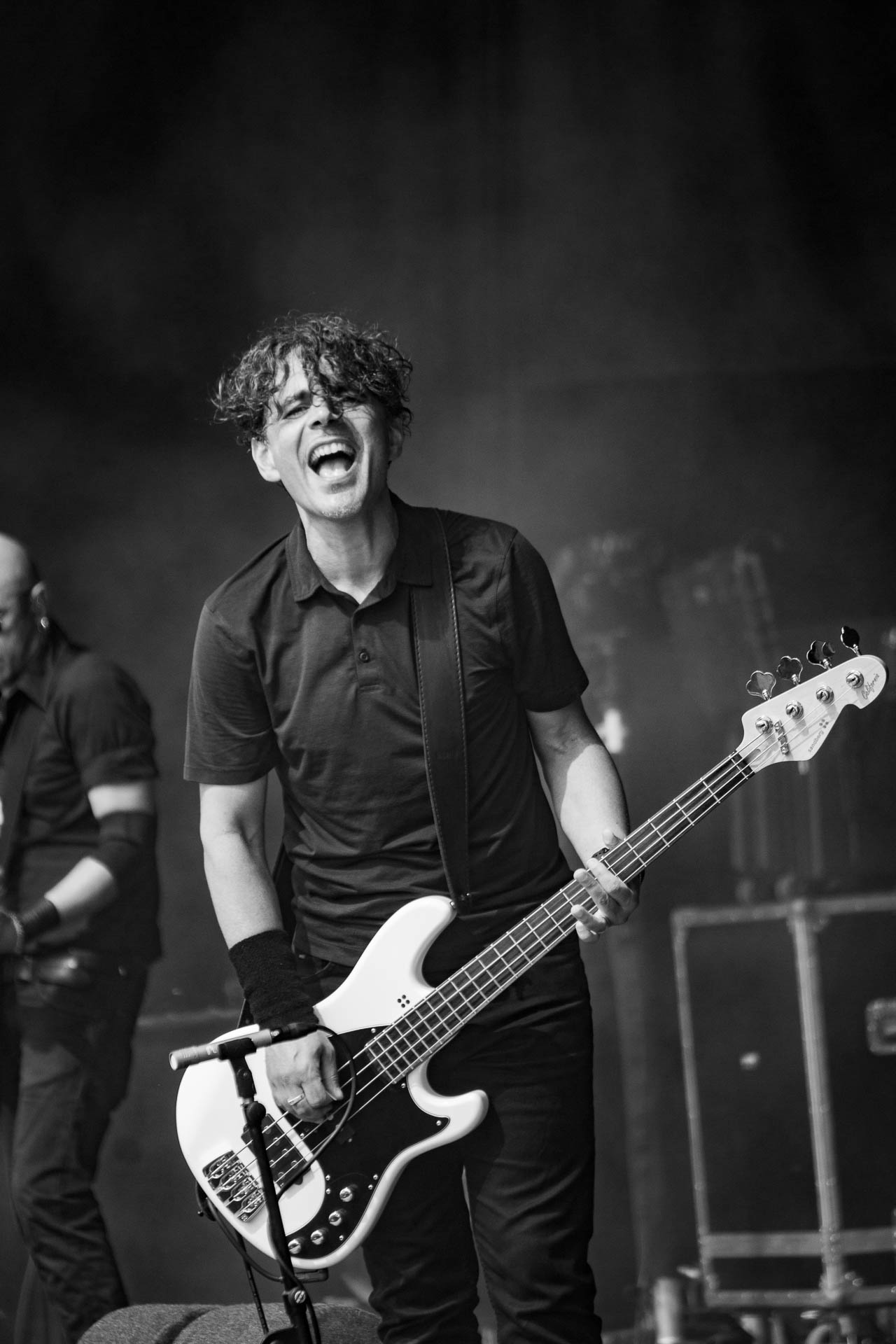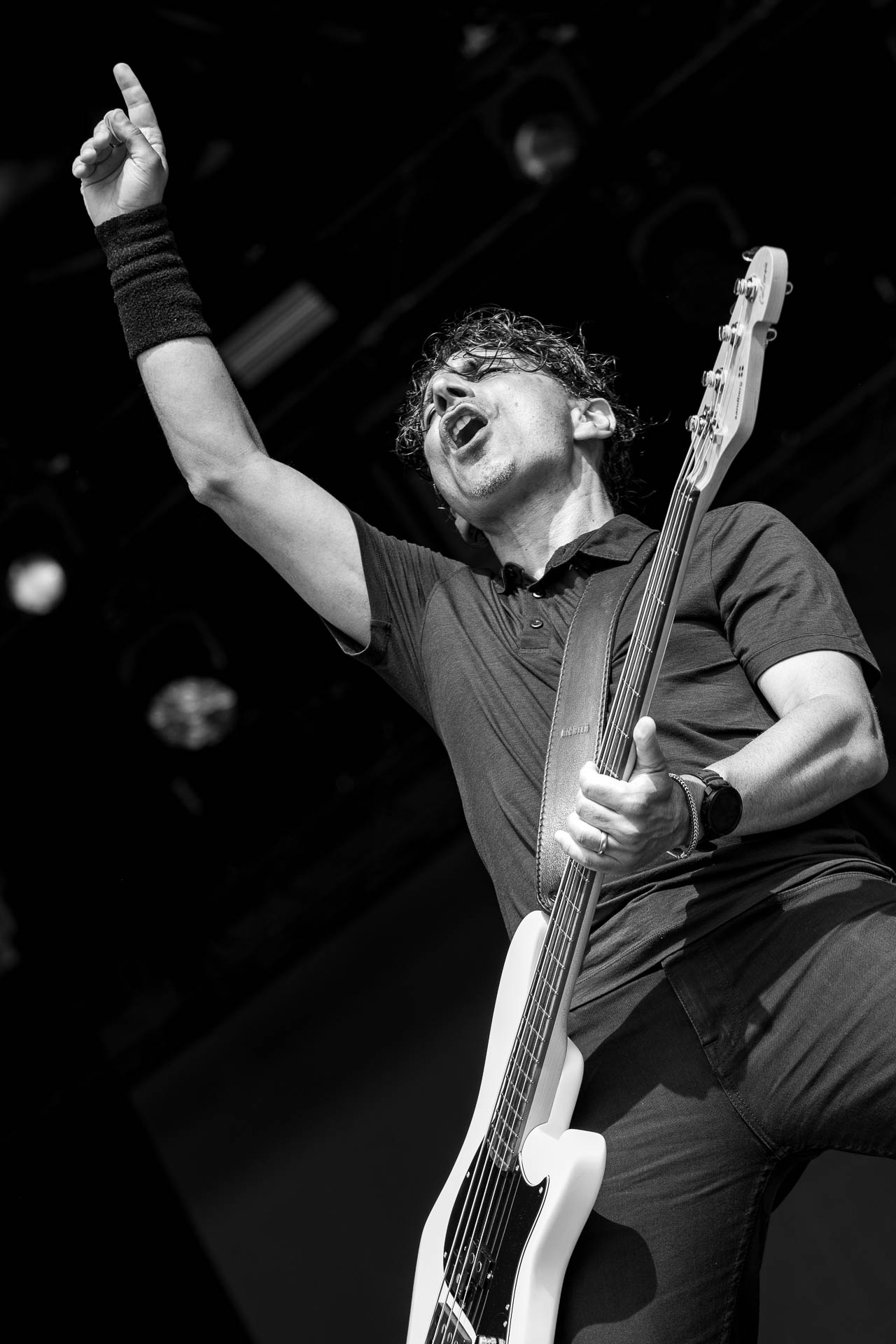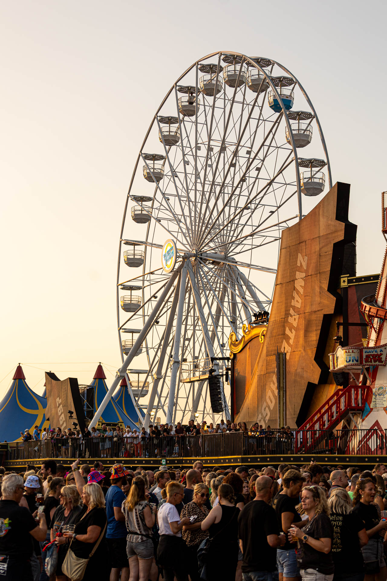 Auf der Bühne erscheint der Ansager des Festivals und kündigt eine kanadische Band an, die hier bereits 2018 auf der Bühne stand: Danko Jones. Vor zwei Wochen haben wir sie noch im Regen beim Ruhrpott Rodeo in Hünxe erleben dürfen. Heute dann Hitze und Sonnenschein. Bassist John Calabrese hat anscheinend immer gute Laune und strahlt das Publikum an. Namensgebender Sänger Danko Jones befindet sich wieder voll in seiner Rolle und schmettert feinsten Rock´N´Roll durch das Mikrofon. Die Ansagen sind doch sehr ähnlich im Vergleich zu vor zwei Wochen. Egal, eine gute Band darf das. Nachdem wir den Fotograben verlassen, bleiben wir noch vorne vor der Bühne, warum ist hier denn so wenig los? Wir entscheiden uns auch einen der Balkons noch zu besuchen, die sich rechts und links unterhalb der Riesenräder von der Bühne befinden, und von wo man einen schönen Blick auf die Bühne hat. John hat uns im Blick und winkt einmal gut gelaunt rüber.