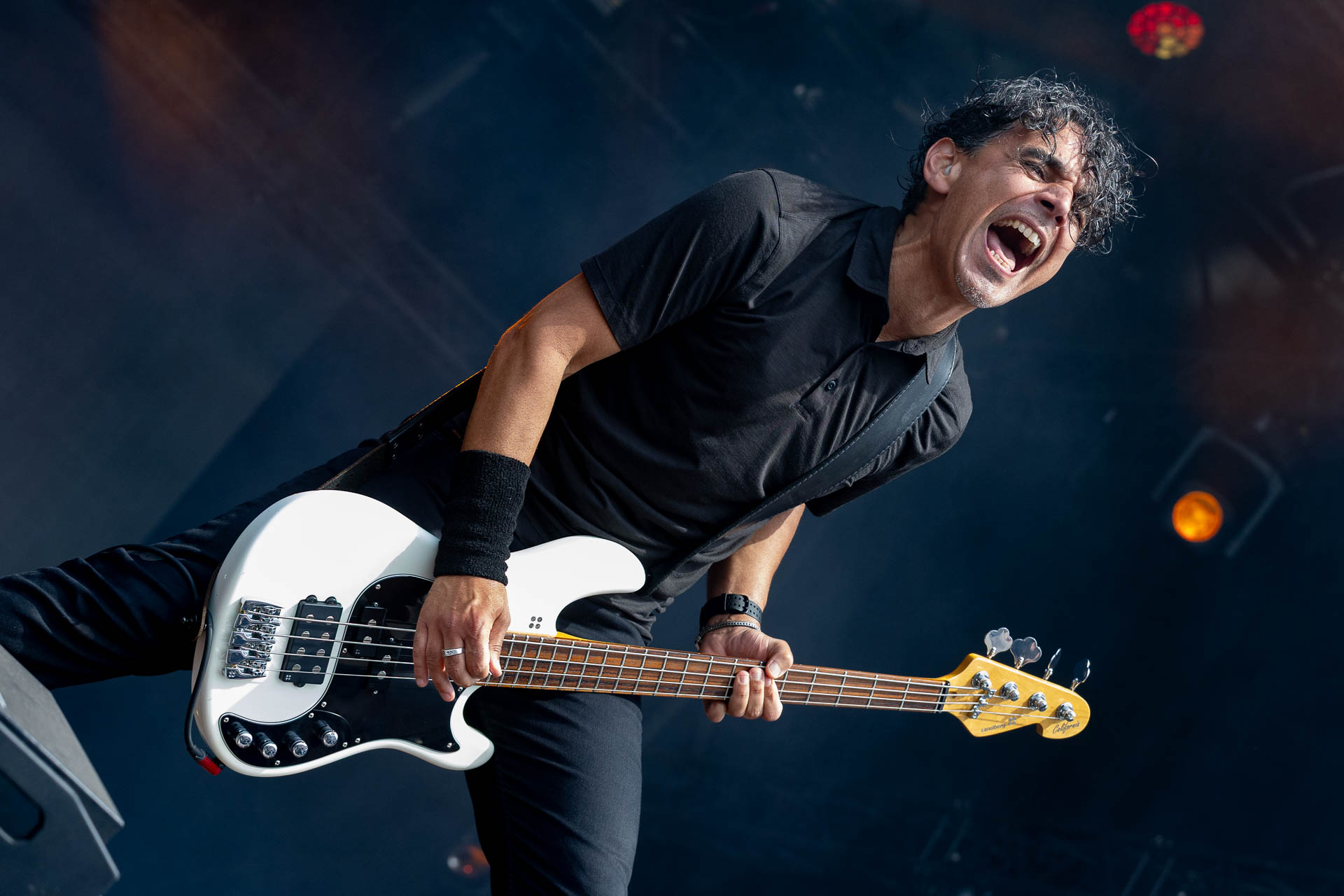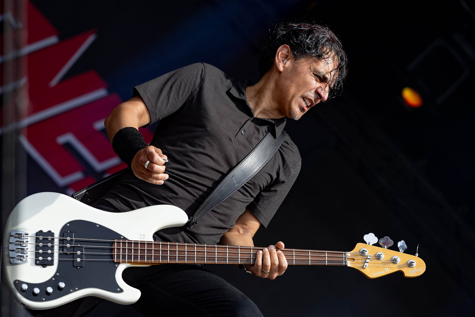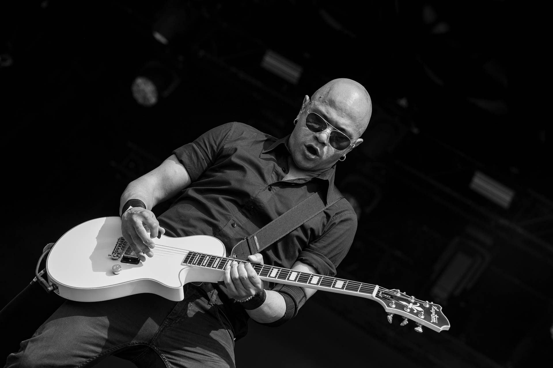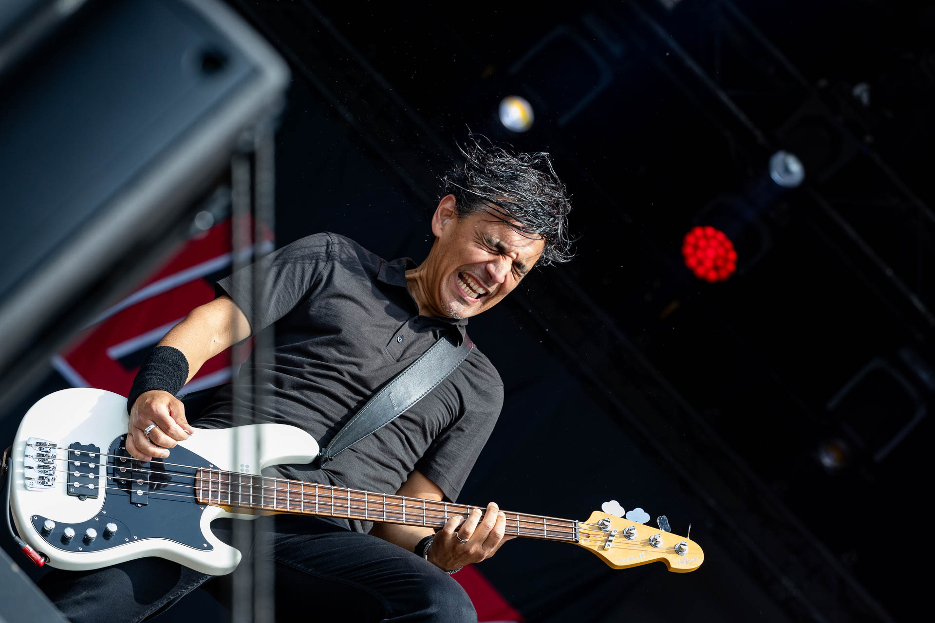 Auf der Bühne erscheint der Ansager des Festivals und kündigt eine kanadische Band an, die hier bereits 2018 auf der Bühne stand: Danko Jones. Vor zwei Wochen haben wir sie noch im Regen beim Ruhrpott Rodeo in Hünxe erleben dürfen. Heute dann Hitze und Sonnenschein. Bassist John Calabrese hat anscheinend immer gute Laune und strahlt das Publikum an. Namensgebender Sänger Danko Jones befindet sich wieder voll in seiner Rolle und schmettert feinsten Rock´N´Roll durch das Mikrofon. Die Ansagen sind doch sehr ähnlich im Vergleich zu vor zwei Wochen. Egal, eine gute Band darf das. Nachdem wir den Fotograben verlassen, bleiben wir noch vorne vor der Bühne, warum ist hier denn so wenig los? Wir entscheiden uns auch einen der Balkons noch zu besuchen, die sich rechts und links unterhalb der Riesenräder von der Bühne befinden, und von wo man einen schönen Blick auf die Bühne hat. John hat uns im Blick und winkt einmal gut gelaunt rüber.