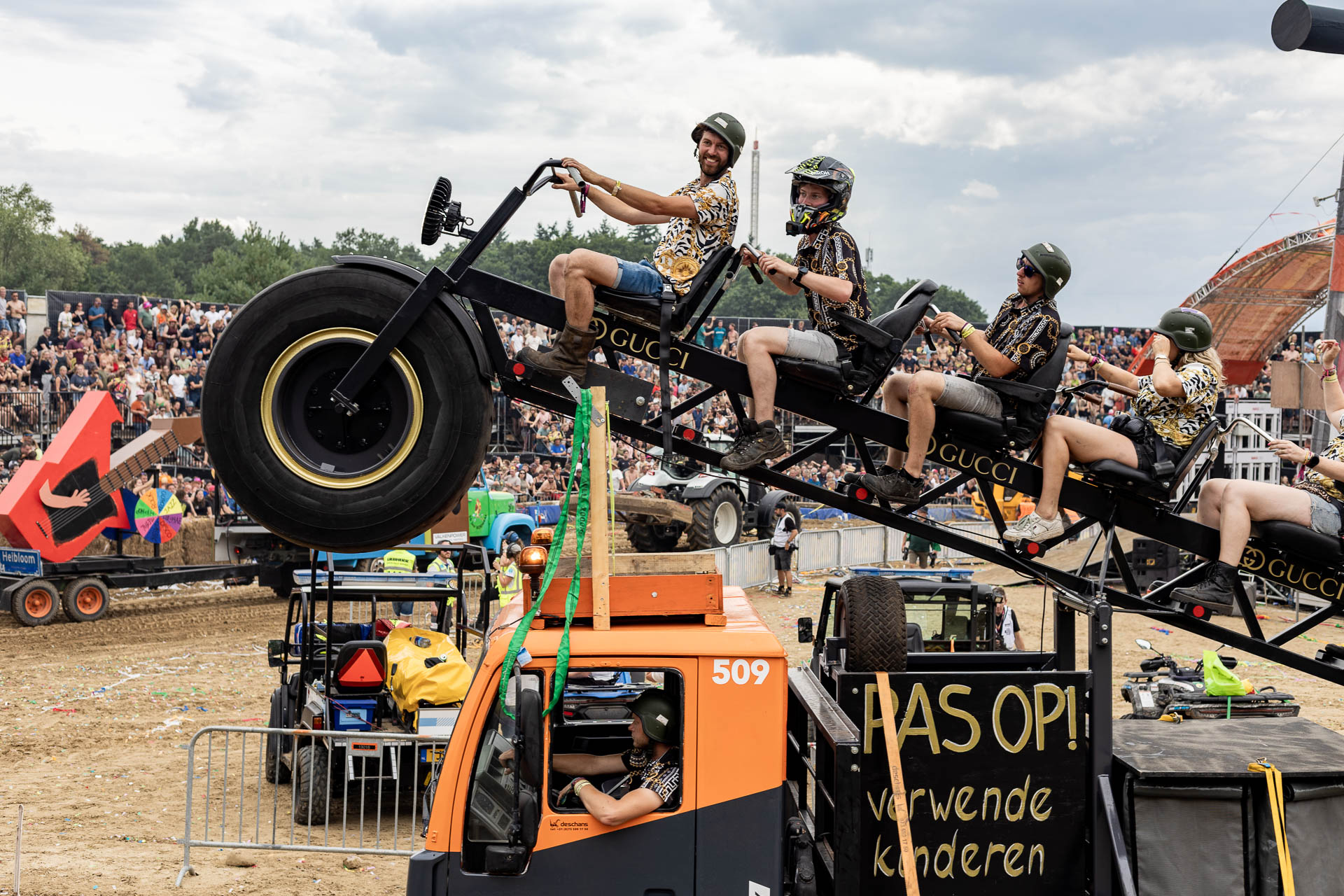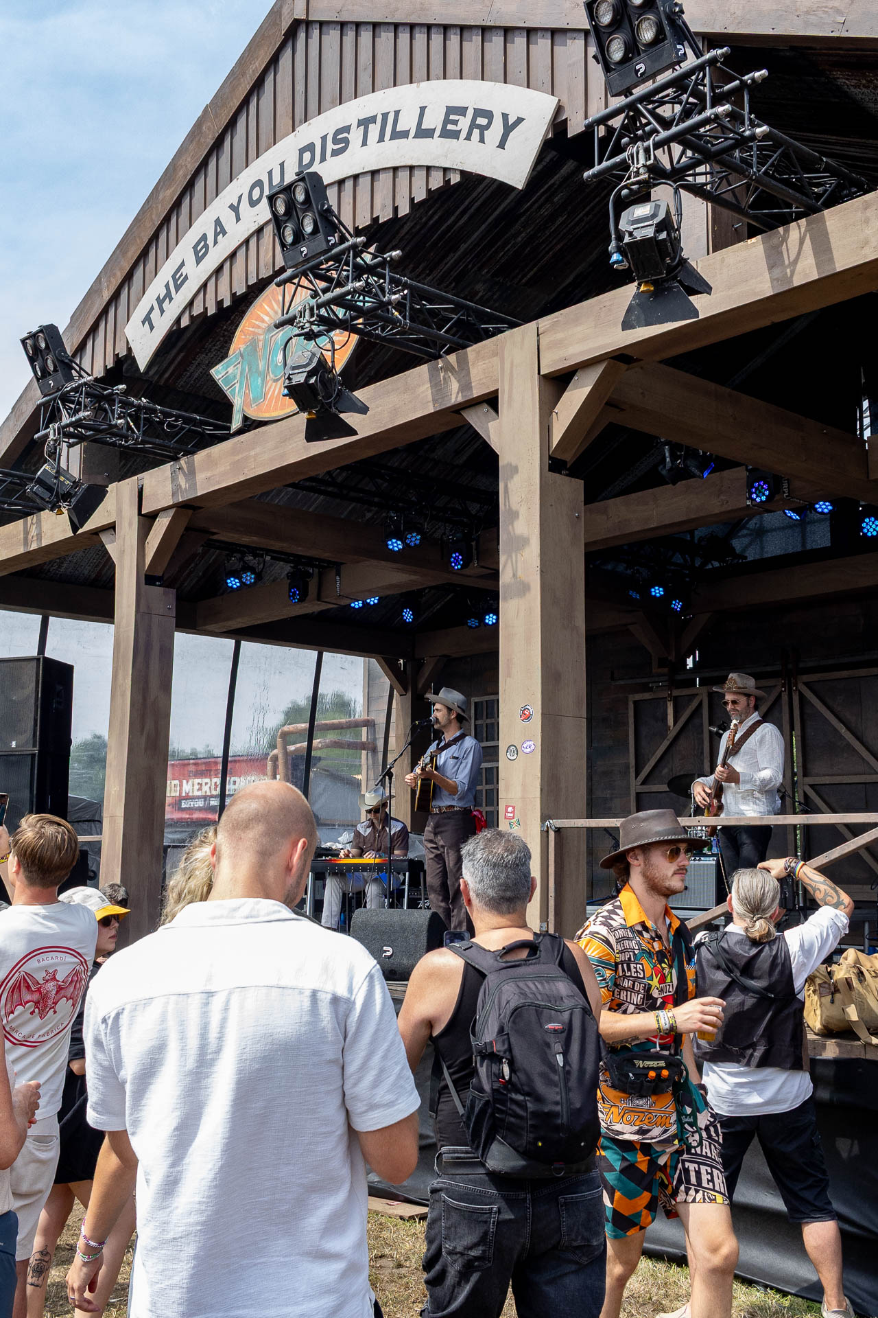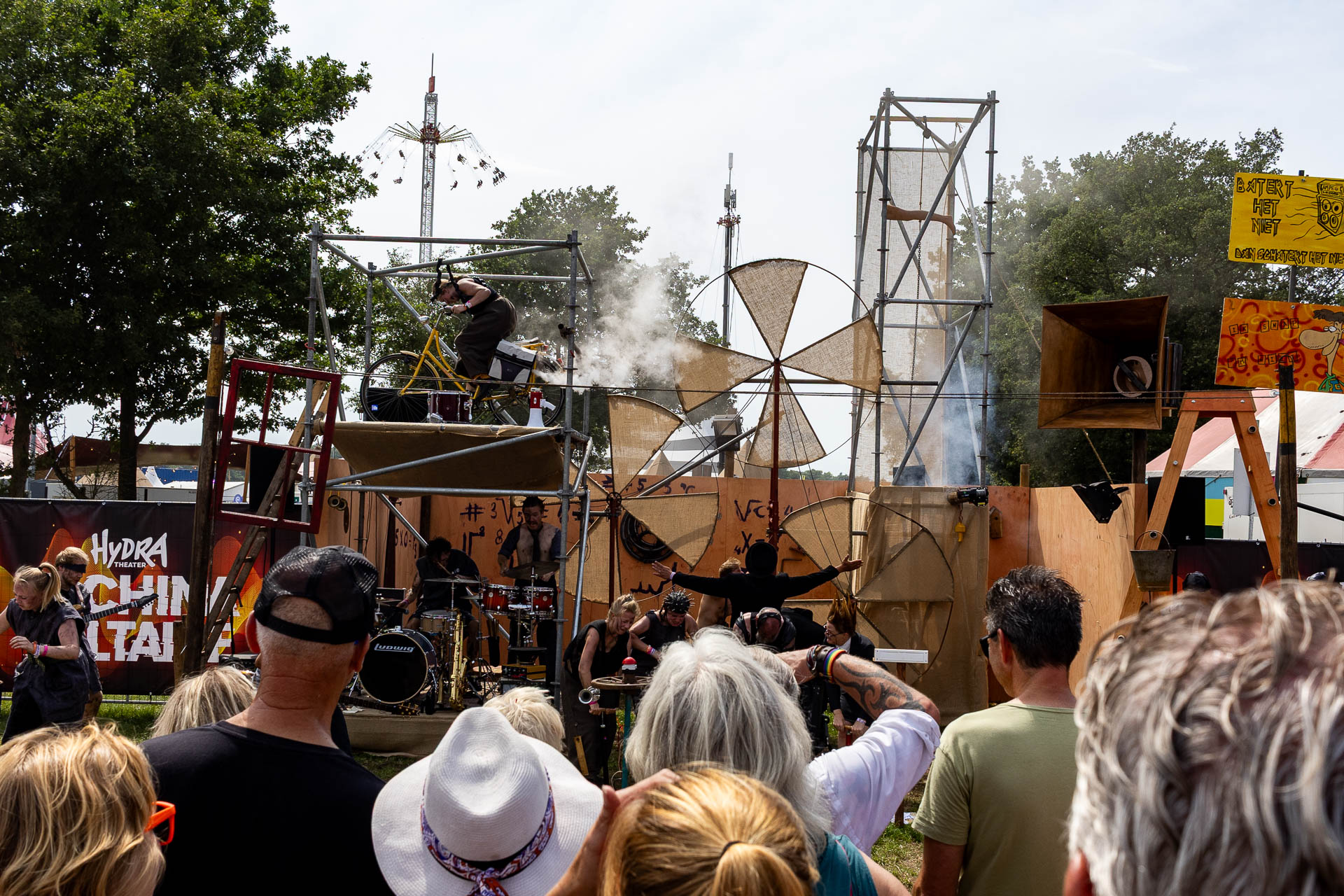 Ein erster Gang über das riesige Festivalgelände, vorbei am Megatent, wo gerade die Dutch Dubliners mit irischer Musik die Meute in Bewegung setzt, dem Discozelt, dem Dansvloer für elektronische Musik und der gewaltigen Hauptbühne mit ihren zwei Riesenrädern, geht es für mich zum Roadhouse. In einer aufgebauten Scheune schaue ich mir die erste Band des Tags an: Dune Rats. Die australische Band aus Bisbane hatte die Besucher im zweistöckigen Gebäude direkt im Griff. Energiegeladen auf und vor der Bühne.