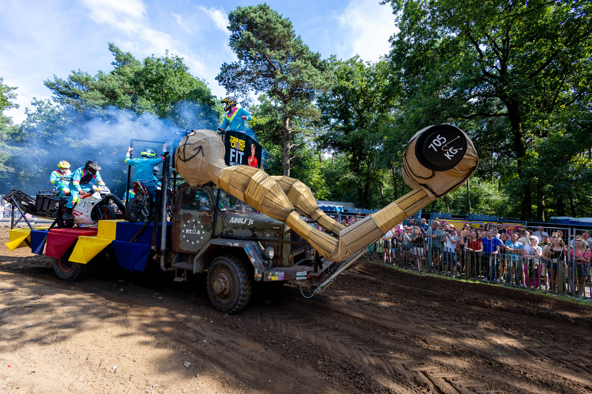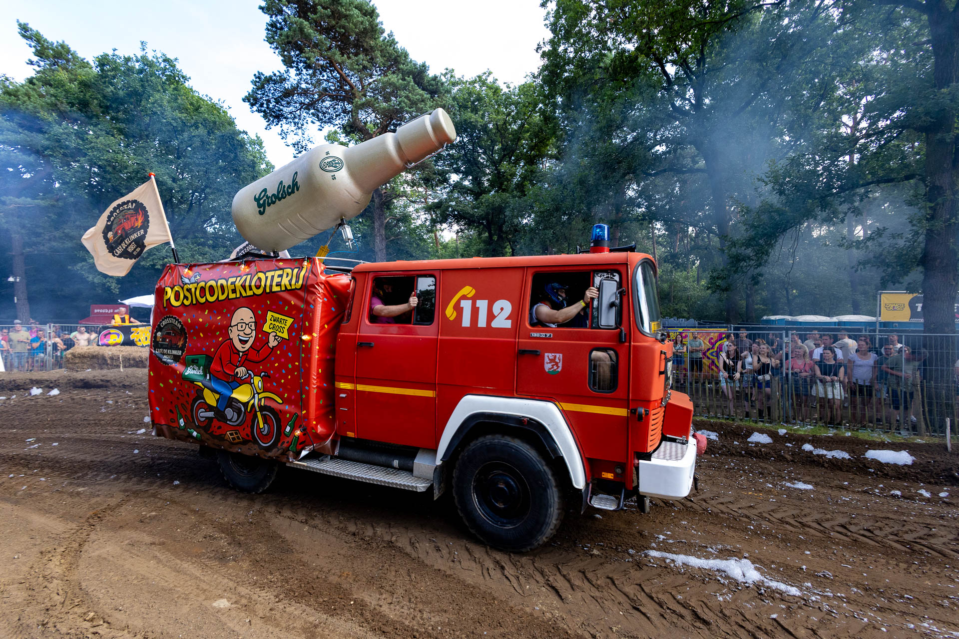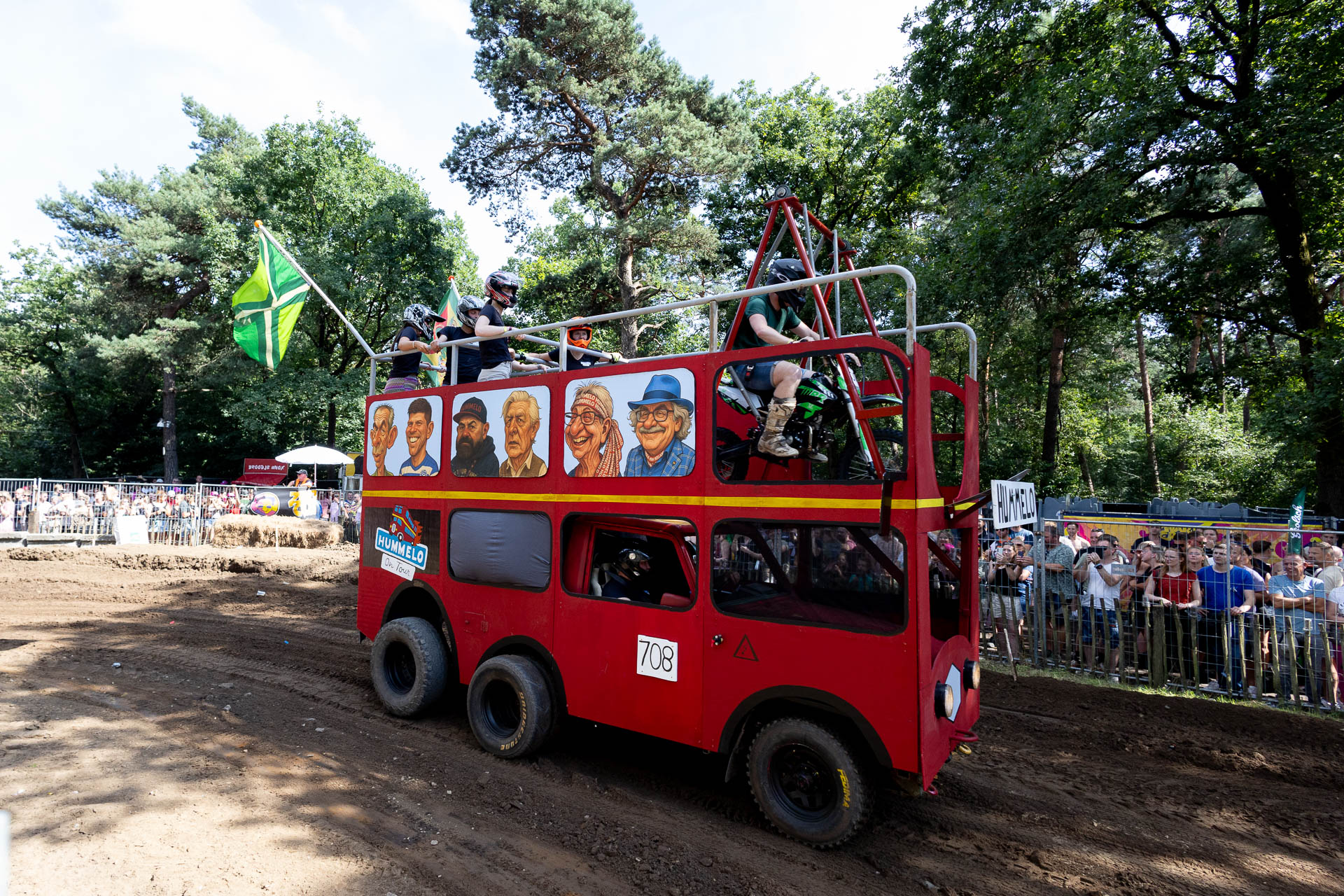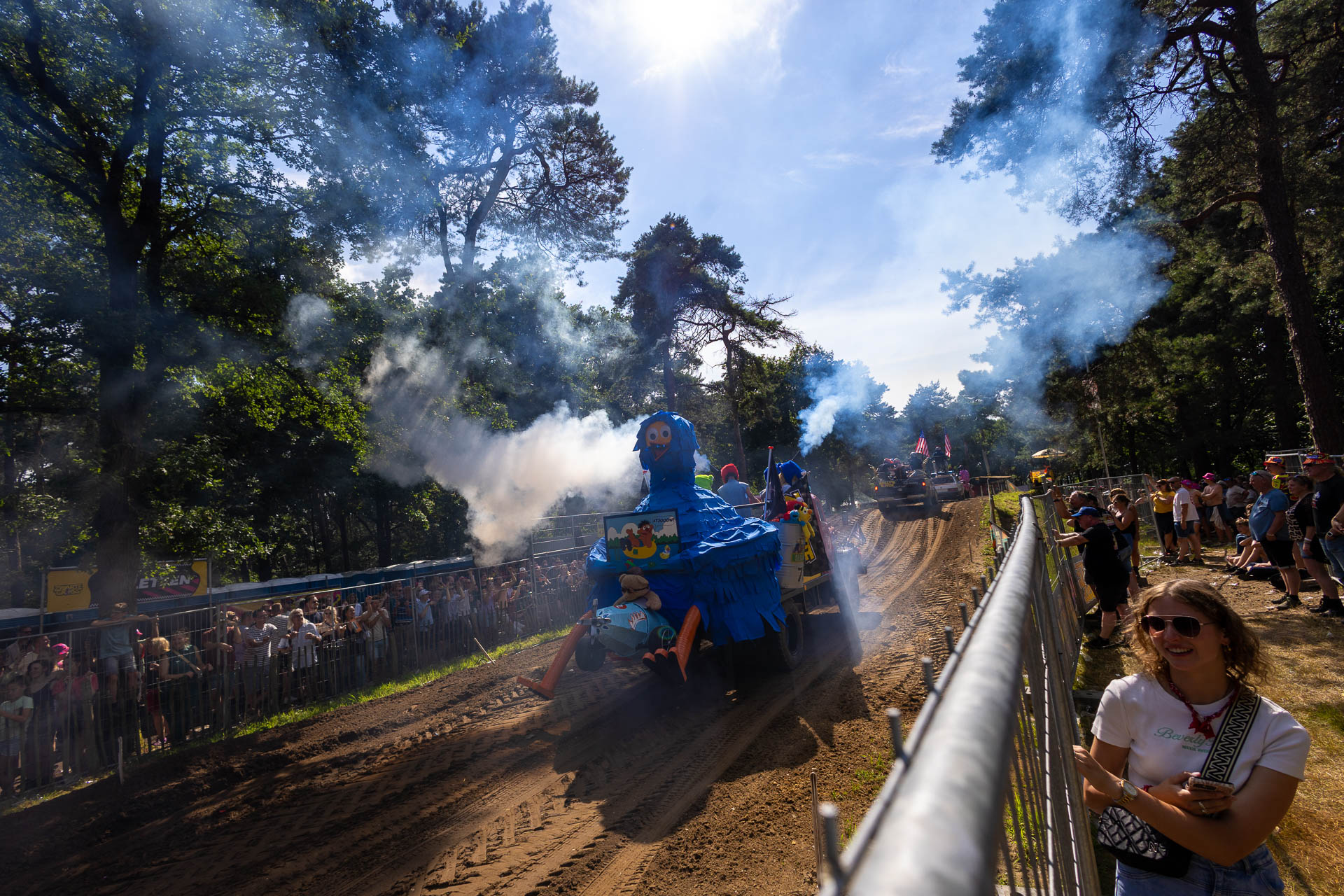 Wir begeben uns in Richtung Hauptbühne zur Crossbahn. Anscheinend hat gerade eine Band den Auftritt auf der Bühne beendet. Wir finden uns in einer Massenwanderung wieder. So lange habe ich noch nie gebraucht um die Theaterweide zu überwinden. An der Crossbahn angekommen wird es im Wald etwas weniger besucht. Wir stellen uns an den Zaun und schauen die ersten Wagen an, die an uns vorbei donnern. Nach der Specialklasse gehen wir weiter der Strecke entlang. Überall ist hier Programm, sogar mitten im Wald wird eine Bühne aufgebaut. Wir entscheiden uns am Hauptrang noch einmal Pause zu machen und schauen uns von dort die Zwaargewichtklasse an. Wirklich erstaunlich mit welchen selbstgebauten Gefährten die Teilnehmer sich auf die Strecke begeben.