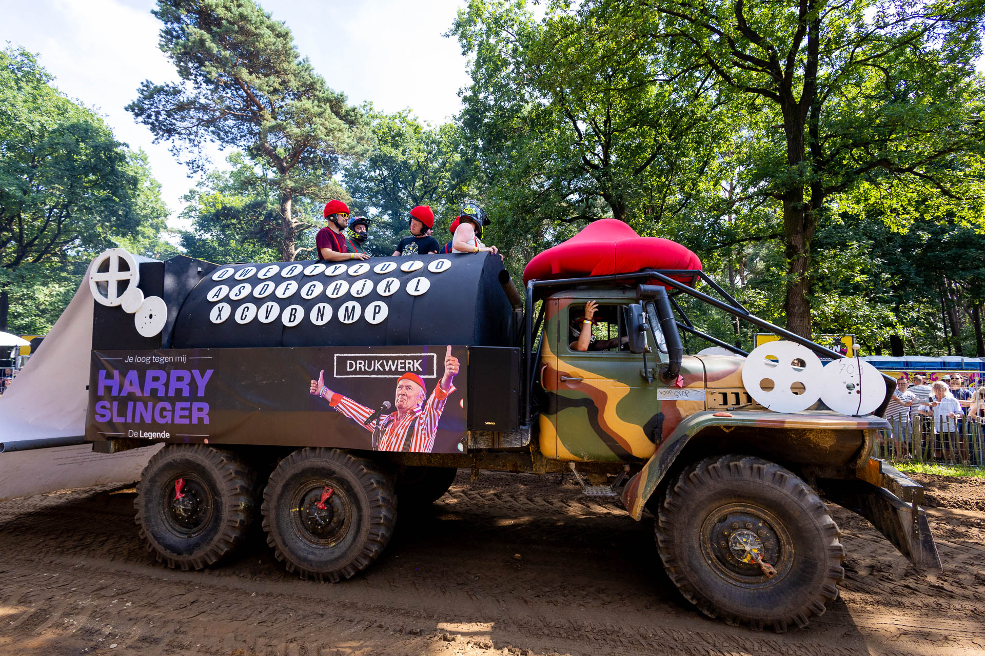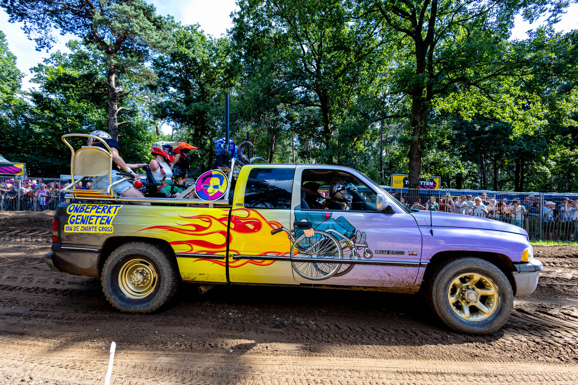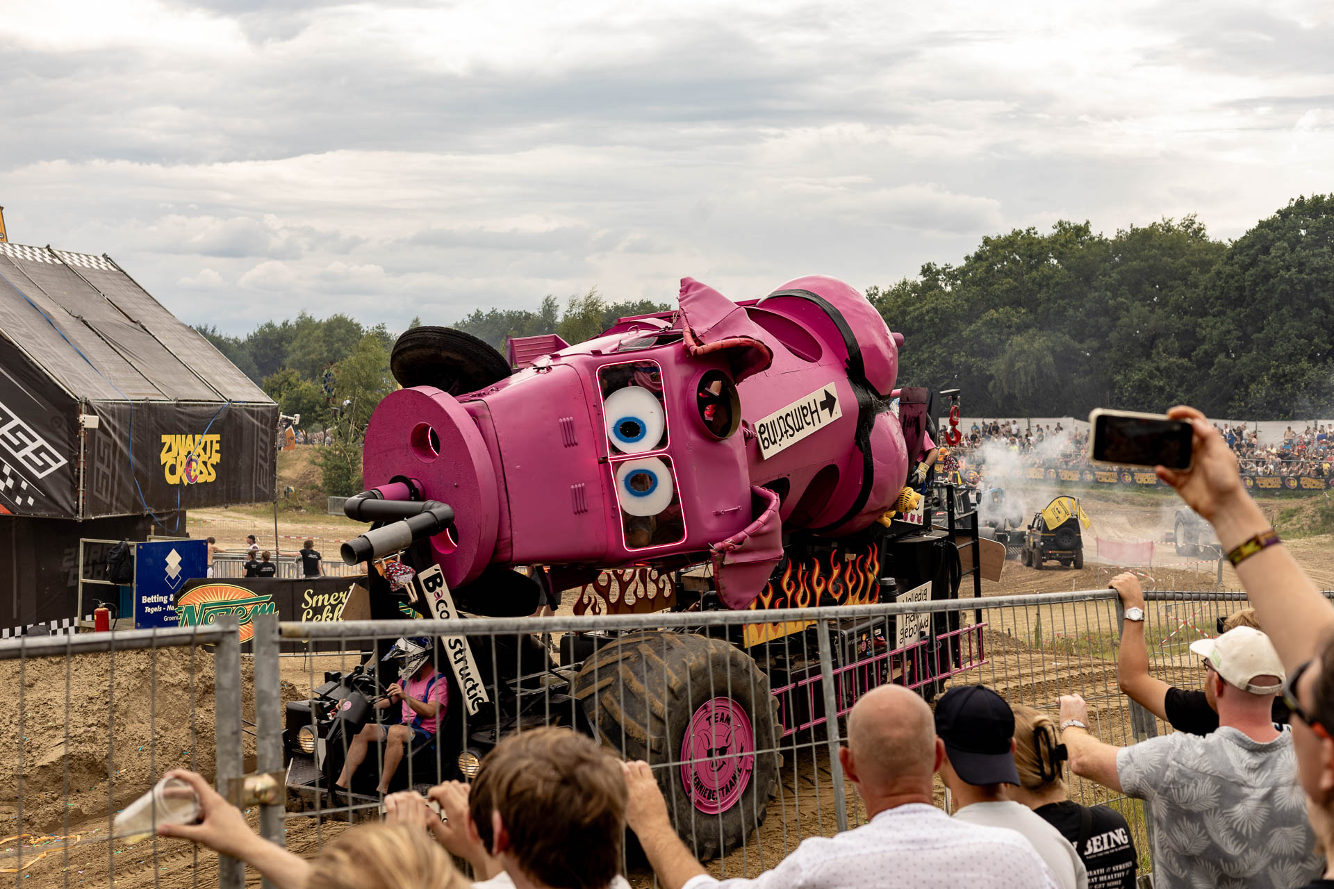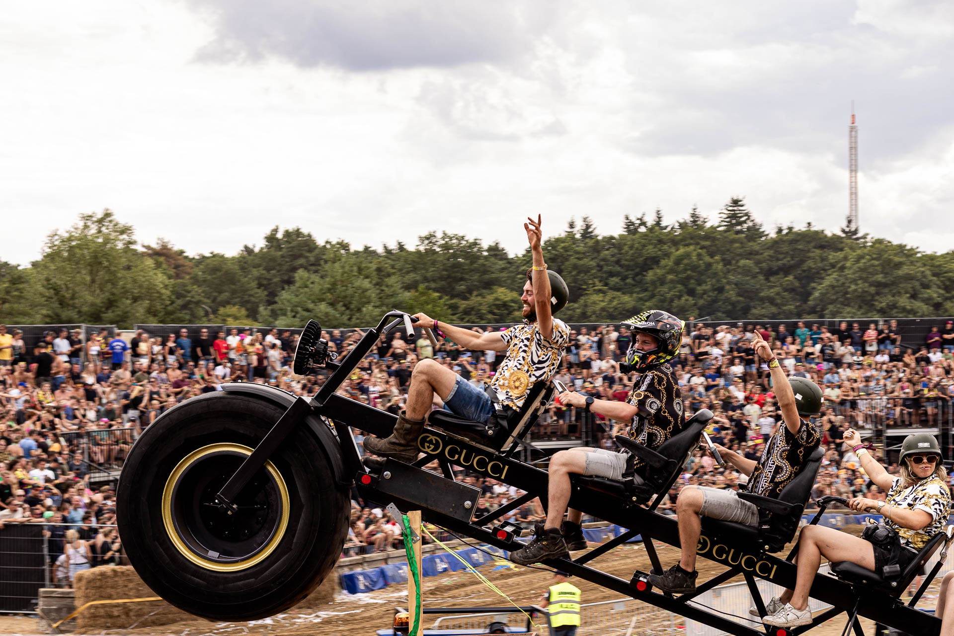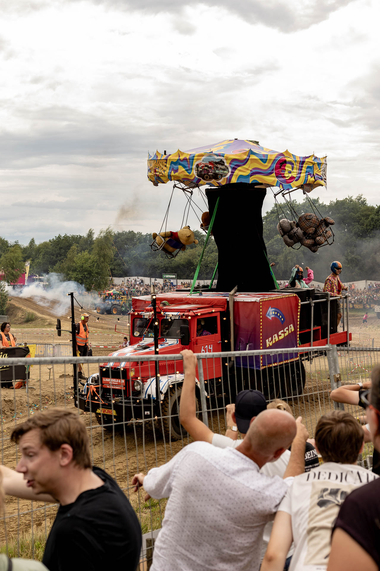 Wir begeben uns in Richtung Hauptbühne zur Crossbahn. Anscheinend hat gerade eine Band den Auftritt auf der Bühne beendet. Wir finden uns in einer Massenwanderung wieder. So lange habe ich noch nie gebraucht um die Theaterweide zu überwinden. An der Crossbahn angekommen wird es im Wald etwas weniger besucht. Wir stellen uns an den Zaun und schauen die ersten Wagen an, die an uns vorbei donnern. Nach der Specialklasse gehen wir weiter der Strecke entlang. Überall ist hier Programm, sogar mitten im Wald wird eine Bühne aufgebaut. Wir entscheiden uns am Hauptrang noch einmal Pause zu machen und schauen uns von dort die Zwaargewichtklasse an. Wirklich erstaunlich mit welchen selbstgebauten Gefährten die Teilnehmer sich auf die Strecke begeben.