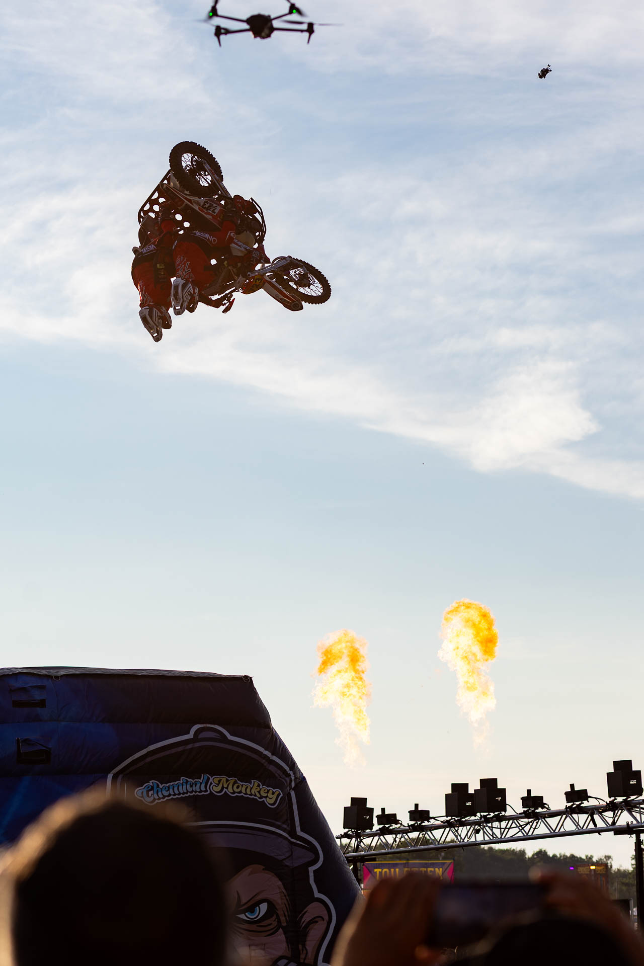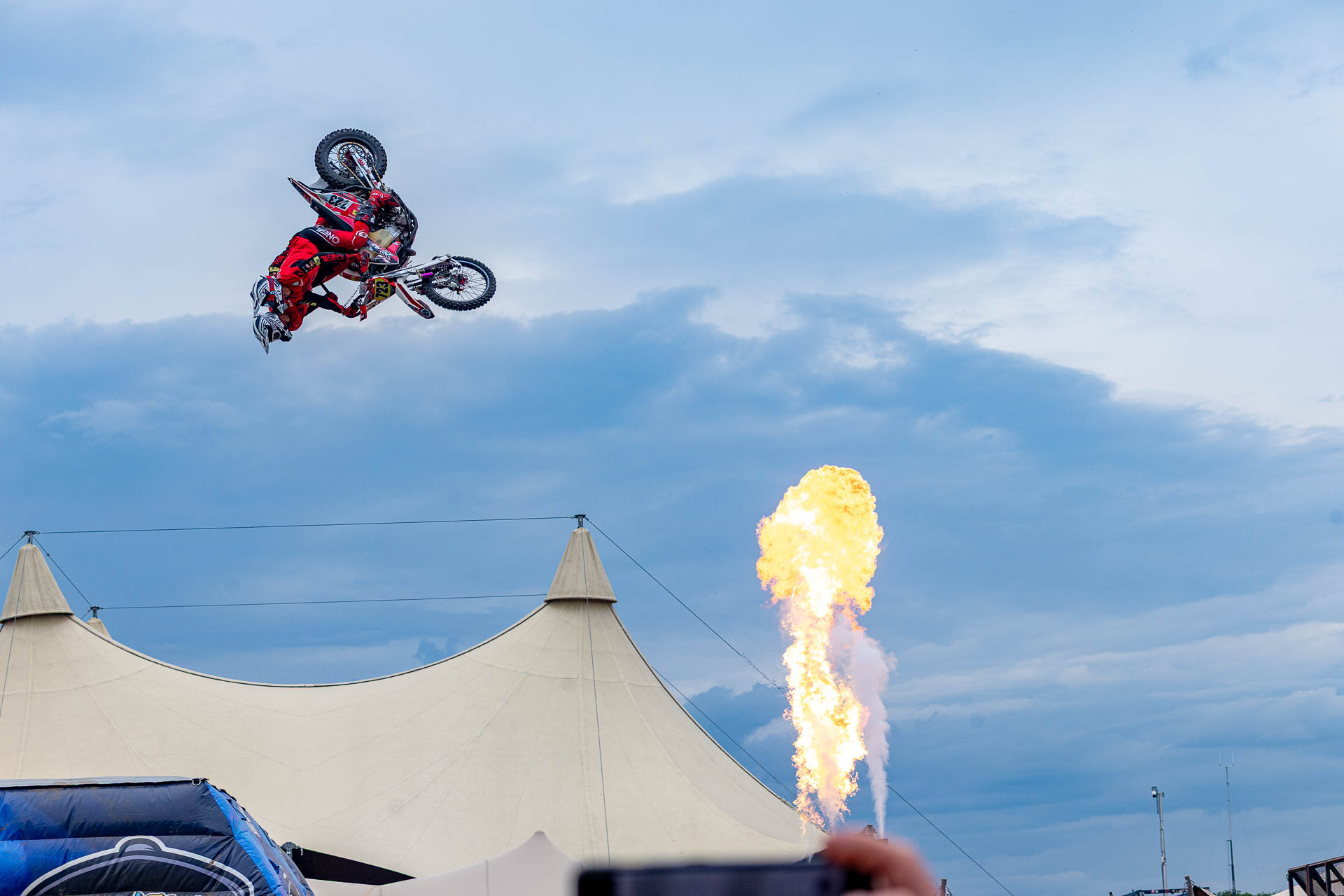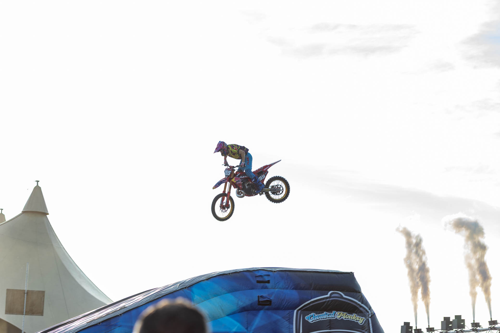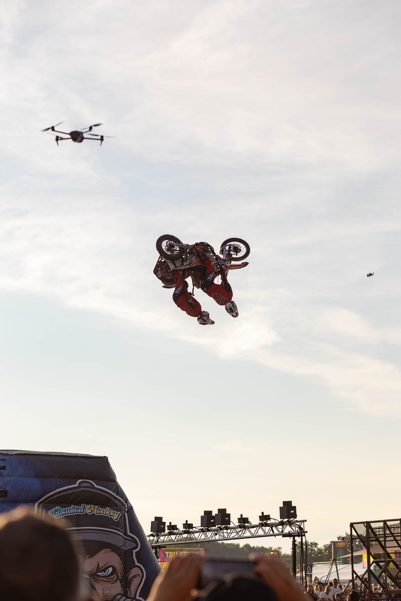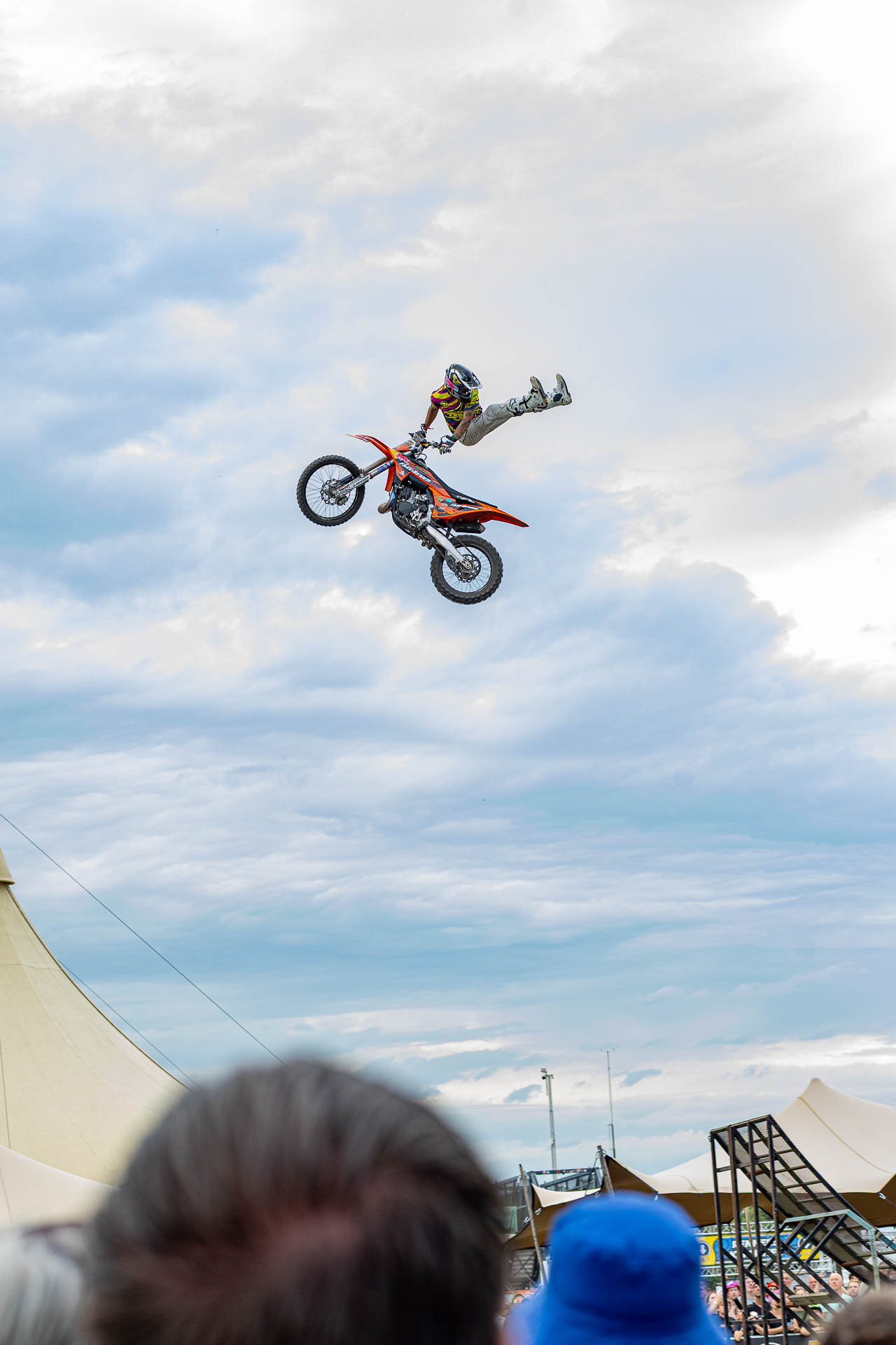 Und erneut bieten die Sportler eine einzigartige Show. Vom hohen Turm nehmen die Skater und BMX Fahrer über eine Rampe Anlauf um sich am Ende in alle Richtungen zu drehen. Auch die Motocrosser zeigen wieder jegliche Formen im Himmel.