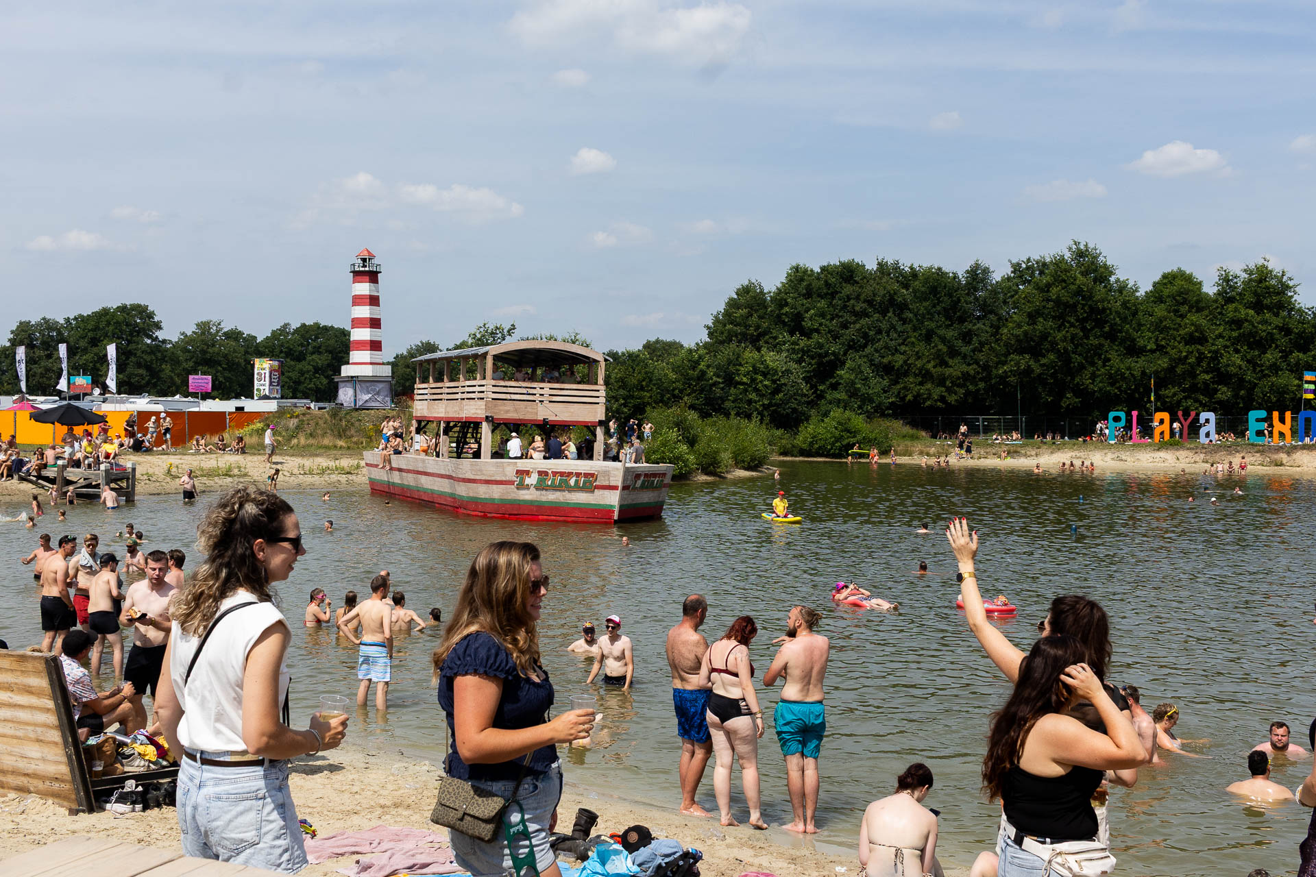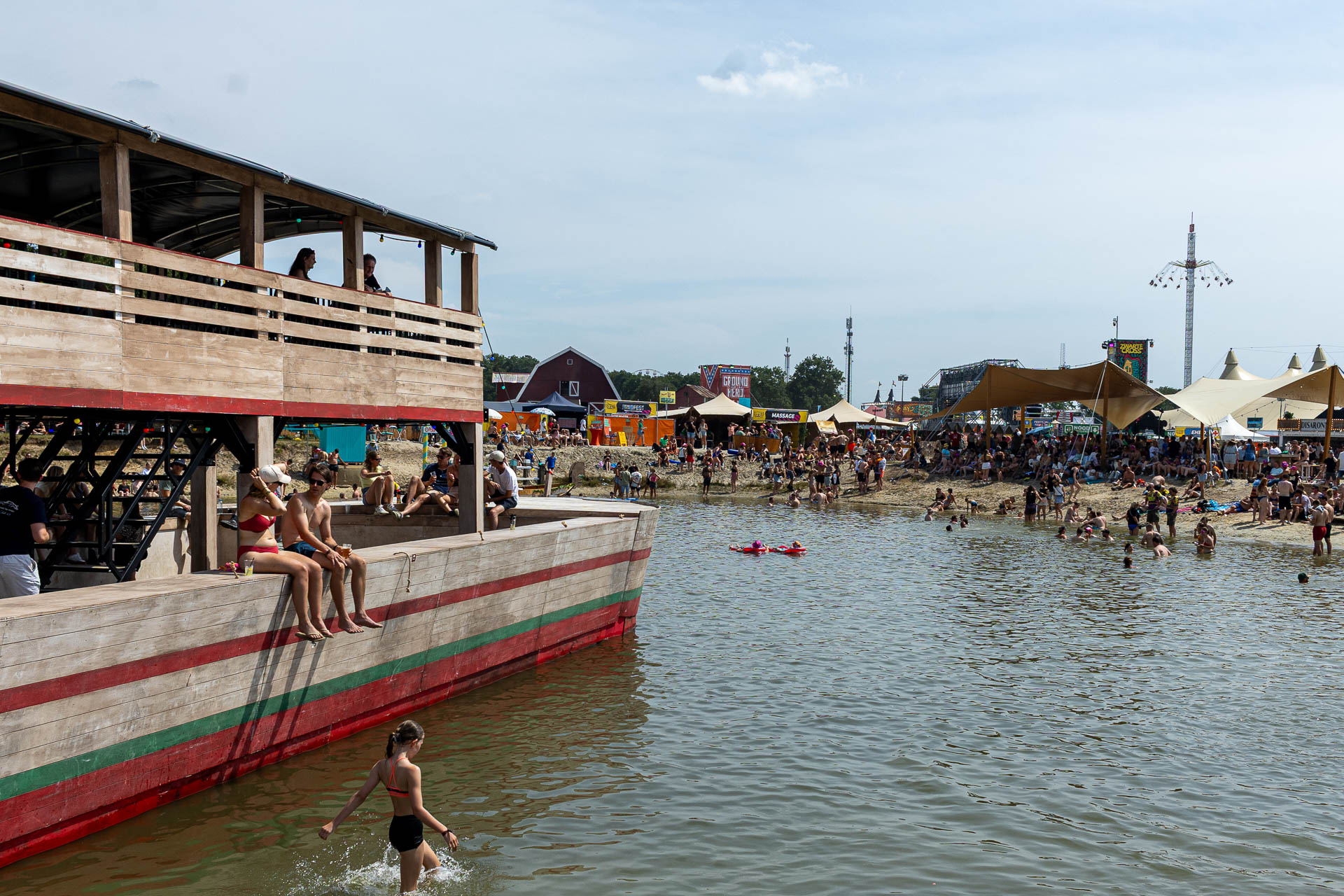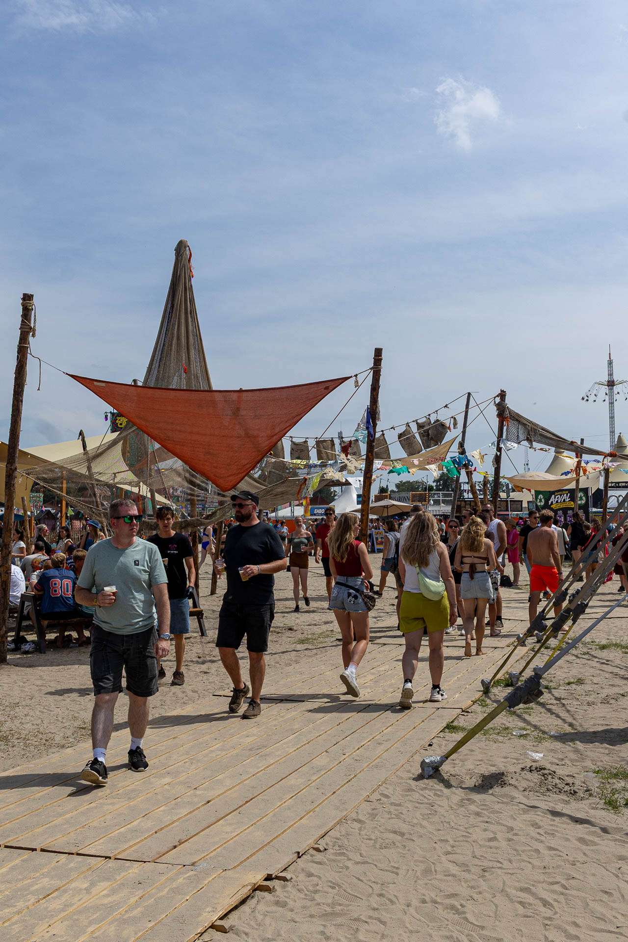 Die Sonne strahlt weiterhin und lässt uns schwitzen. Wir laufen übe das Gelände am Megatent und der Hauptbühne vorbei. Wir wollen erst einmal mit etwas Entspannung und Urlaubsflair in den Tag starten, also machen wir uns auf den Weg zur Playa Exoticana, einem Areal auf dem Gelände, das nur über eine Brücke zu erreichen ist. An diesem See findet sich neben einer Bühne und dem Sandstrand auch ein extra gebautes Schiff, Minigolf, Massagen und ein paar Foodstände. Hier lässt es sich aushalten. Nur Badeklamotten haben wir nicht dabei.