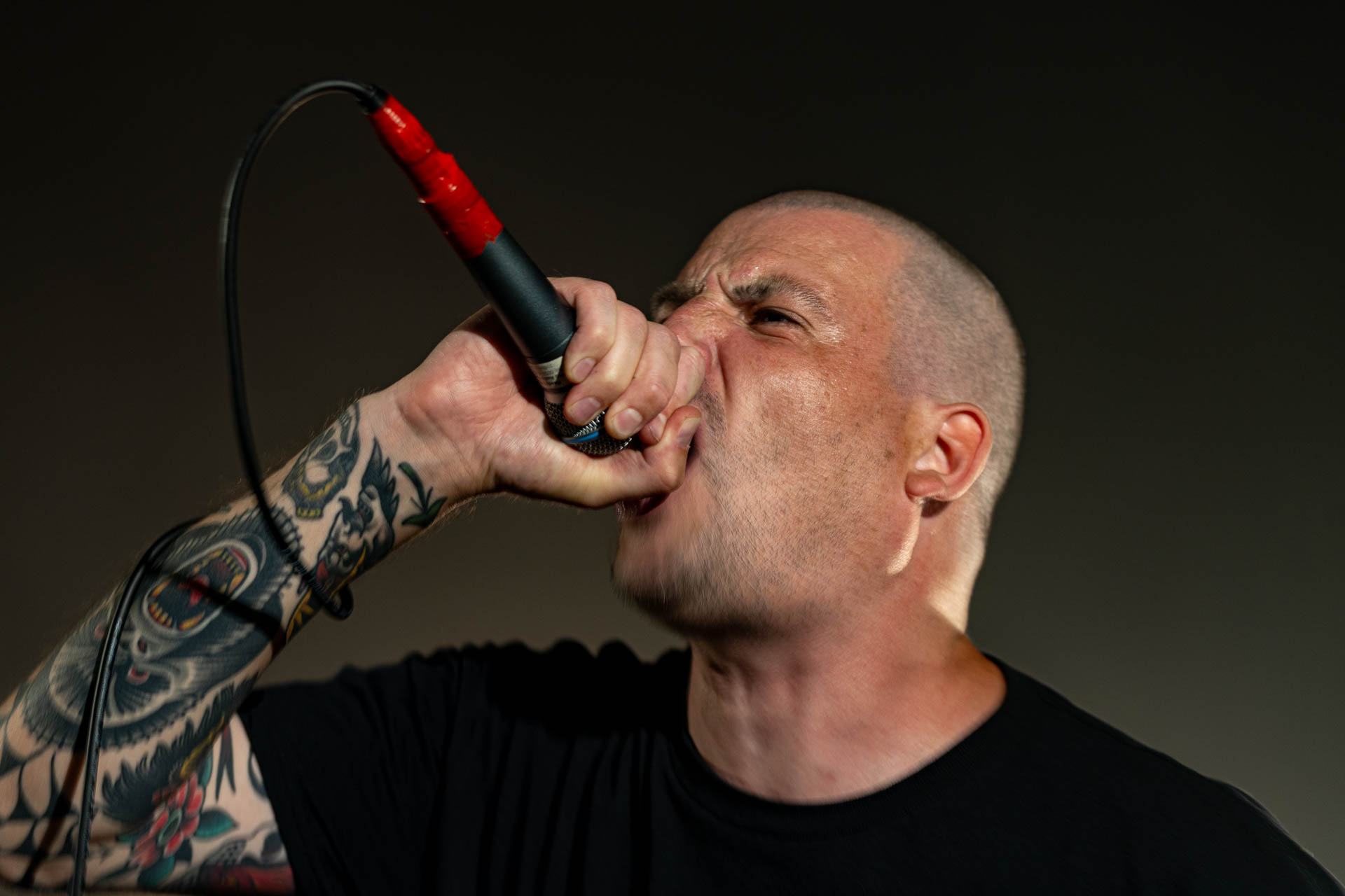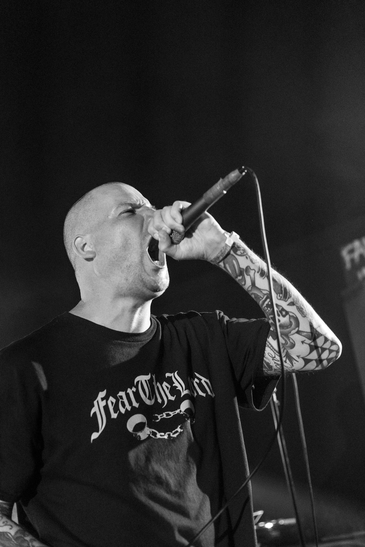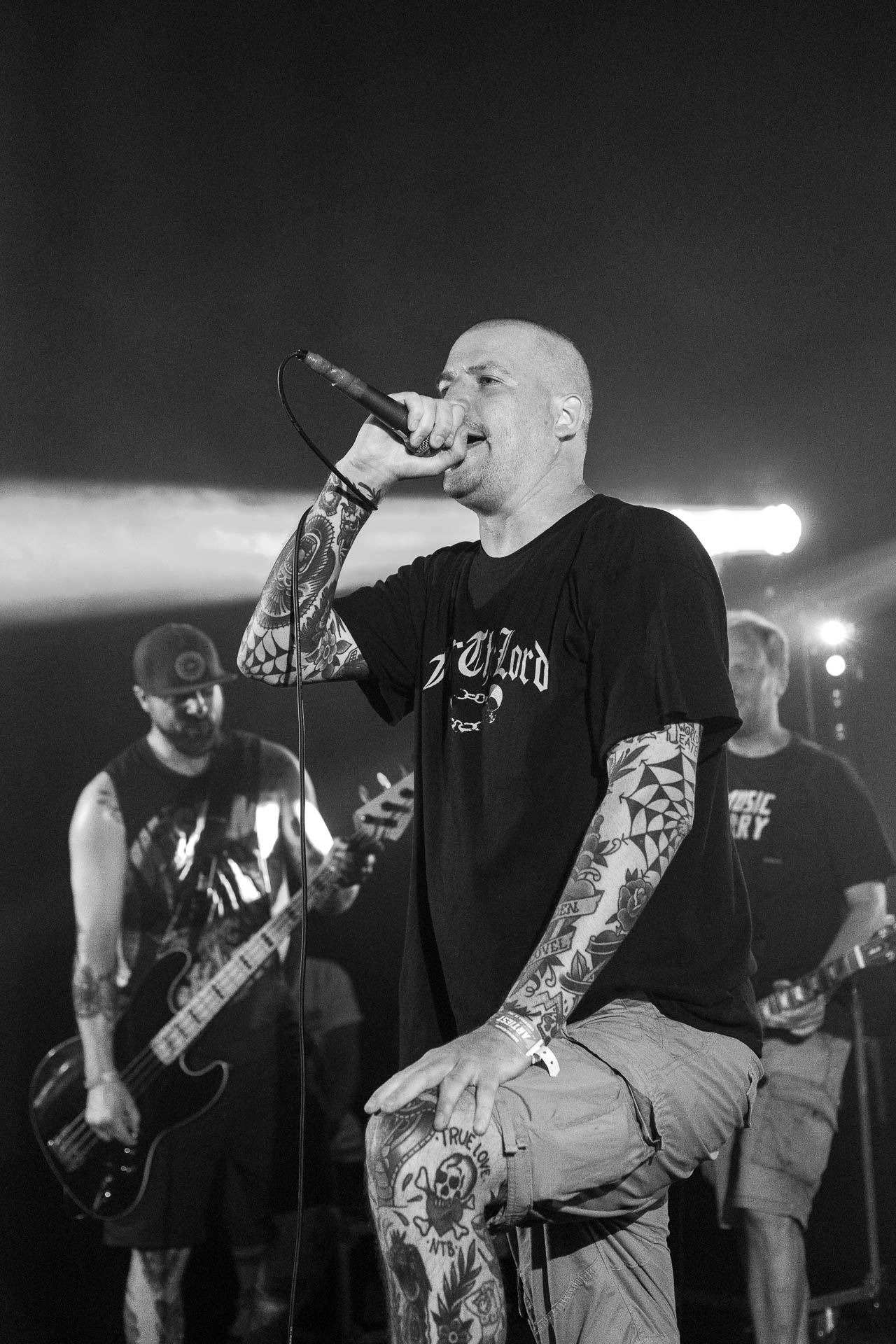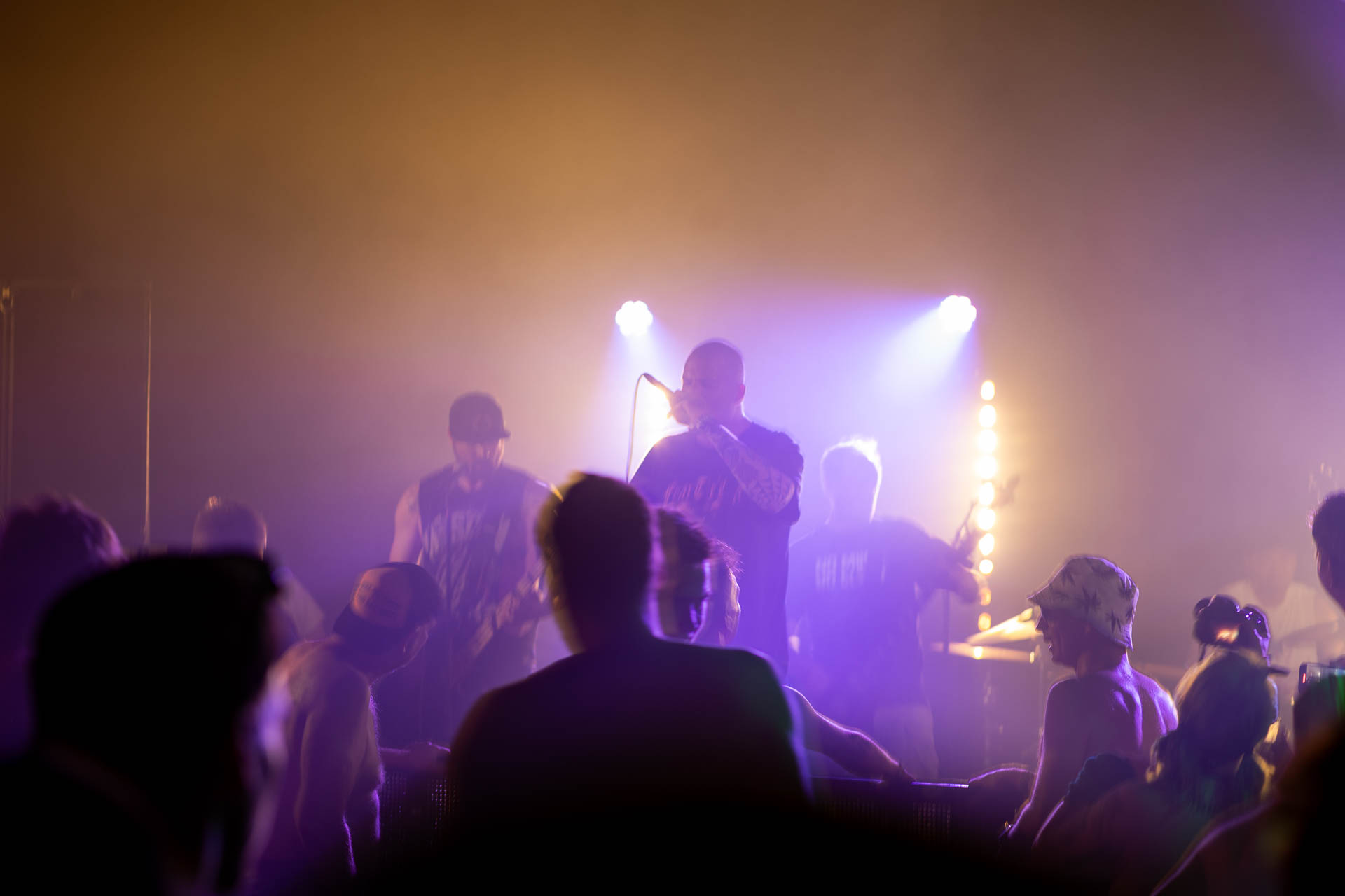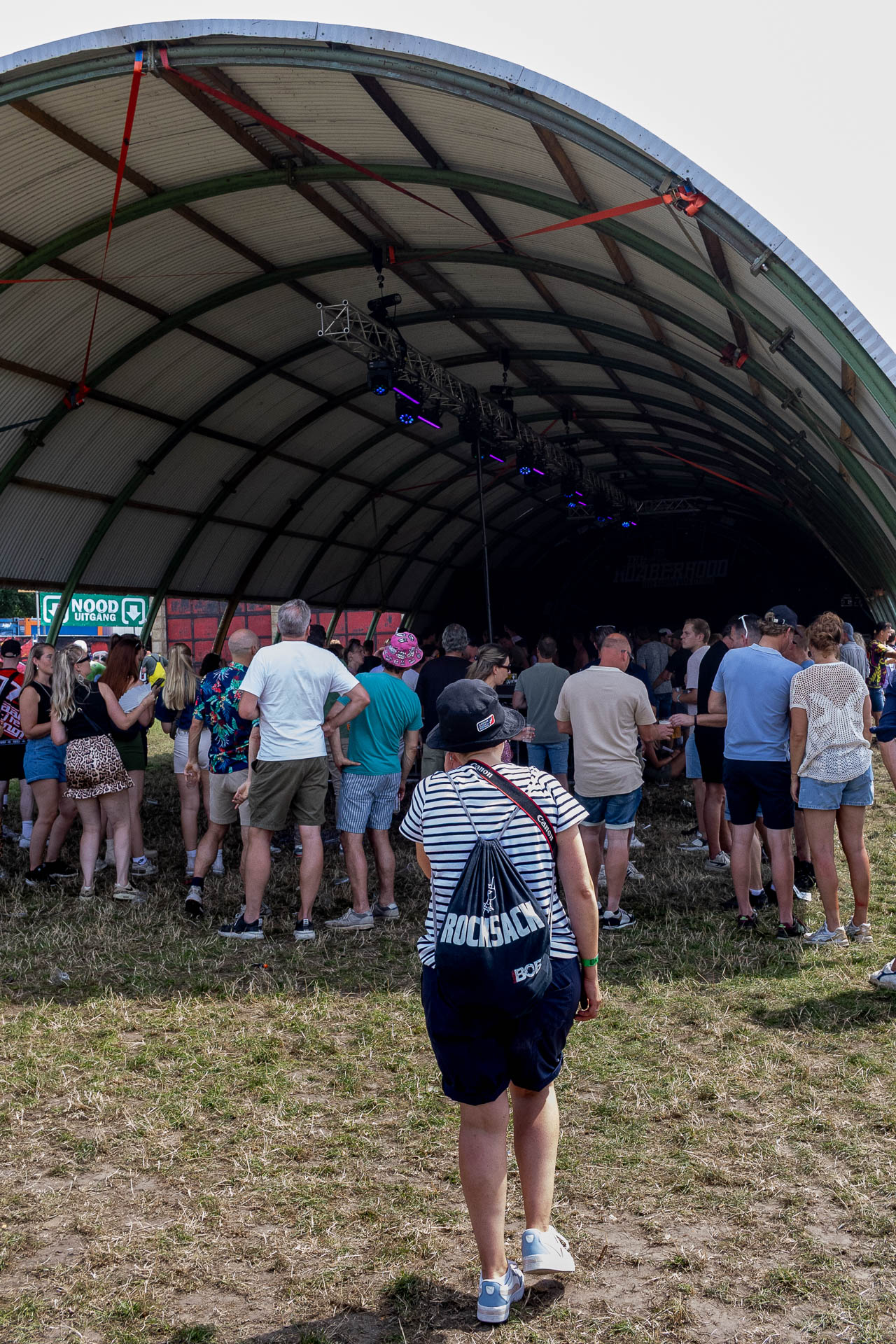 Im Café Harder angekommen stehen No Turning Back auch schon auf der Bühne. Die niederländische Hardcore-Band donnert von vorne und die Menschen fliegen nur so über die nasse Tanzfläche im Zelt. Julia bleibt hier lieber etwas weiter hinten, bei den besoffenen umherwirbelnden Publikum verständlich. Ich kämpfe mich nach vorne durch und schieße ein paar Fotos, soweit es in dem Getümmel denn funktioniert. Man merkt, die Band hat ein Heimspiel und wird frenetisch gefeiert. Ein paar Lieder schauen wir uns anschließend noch von hinten an, bevor wir wieder raus gehen. Die Hitze hier drin ist echt extrem.